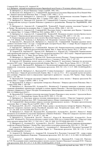55. Кудашов А.С., Андреев К.М., Выборнов А.А., Алешинская А.С., Васильева И.Н., Сомов А.В., Пантелеева Т.Ю. Исследования нового памятника раннего неолита лесного Среднего Поволжья Сокольный XVII // Поволжская археология. 2024. № 1 (47). С. 8-26. DOI: 10.24852/pa2024.1.47.8.26 EDN: MQQPSN