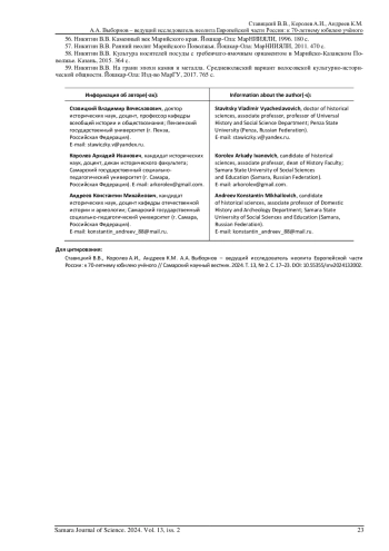 30. Вискалин А.В., Выборнов А.А., Королев А.И., Ставицкий В.В. Энеолитическое поселение Ховрино в Посурье // Вопросы археологии Поволжья. Вып. 2. Самара: СГПУ, 2002. С. 58-80.