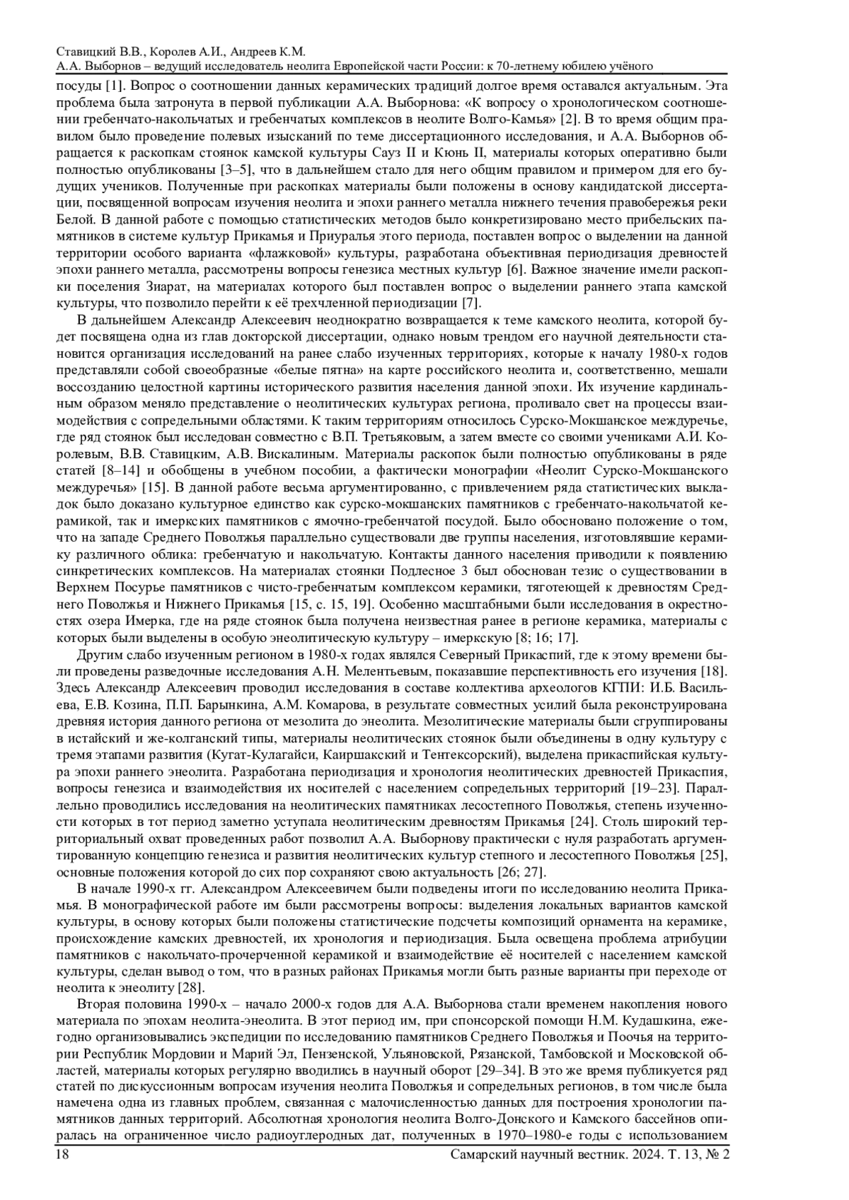 42. Андреев К.М., Выборнов А.А., Васильева И.Н. Стоянка Калмыковка I - новый памятник неолита лесостепного Поволжья // Тверской археологический сборник. Вып. 11: мат-лы 18-го - 20-го заседаний научно-методического семинара “Тверская земля и сопредельные территории в древности” / под ред. И.Н. Черных. Тверь: Триада, 2018. С. 143-160. EDN: NCVGKX
