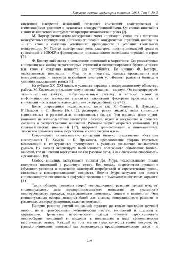 Статья посвящена исследованию эволюции концепций и теоретических подходов к инновационному развитию с акцентом на эволюционные этапы и современные трактовки инноваций в экономике и торговле. Предлагаемый анализ дает всестороннее представление о процессах, происходящих в экономике, и их влиянии на торговлю.