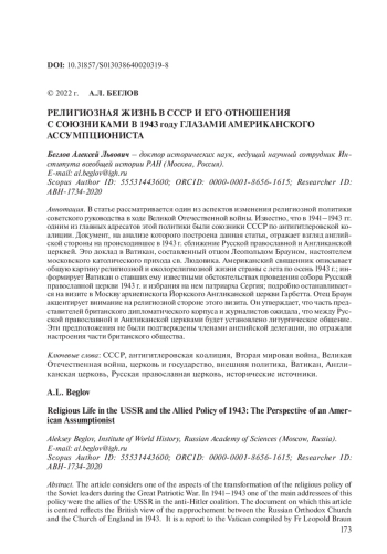 БЕГЛОВ А. Л. РЕЛИГИОЗНАЯ ЖИЗНЬ В СССР И ЕГО ОТНОШЕНИЯ С СОЮЗНИКАМИ В 1943 ГОДУ ГЛАЗАМИ АМЕРИКАНСКОГО АССУМПЦИОНИСТА // НОВАЯ И НОВЕЙШАЯ ИСТОРИЯ. 2022. № 5