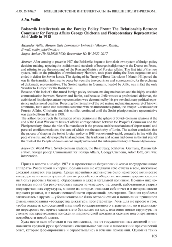 В статье на основе служебной переписки наркома и полпреда реконструирована подготовка ключевых решений в сфере советско-германских отношений на исходе Первой мировой войны, показана роль человеческого фактора в этом процессе, механизм урегулирования ведомственных и личных конфликтов, залогом которого выступал авторитет В. И. Ленина. Автор приходит к выводу, что процесс становления советской внешней политики в 1918 г. шел чрезвычайно быстро, в целом соответствуя темпу событий, и продвигался вперед, преодолевая ошибки. Заложенные в первый год работы Наркоминдела традиции и нормы оказывали немалое влияние на последующую историю советской дипломатии.