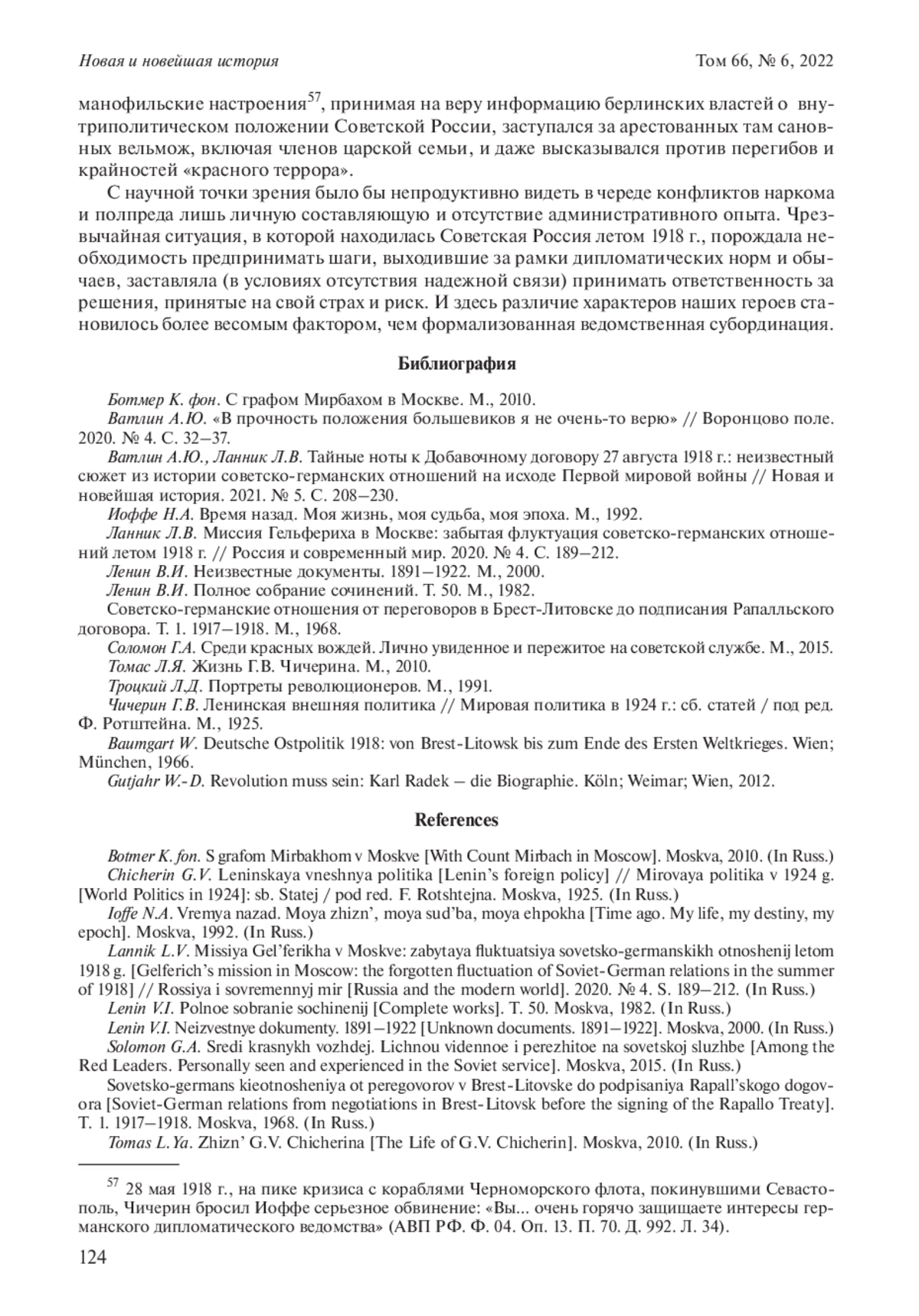 5. Ланник Л.В. Миссия Гельфериха в Москве: забытая флуктуация советско-германских отношений летом 1918 г. // Россия и современный мир. 2020. № 4. С. 189-212. EDN: BRZLIS