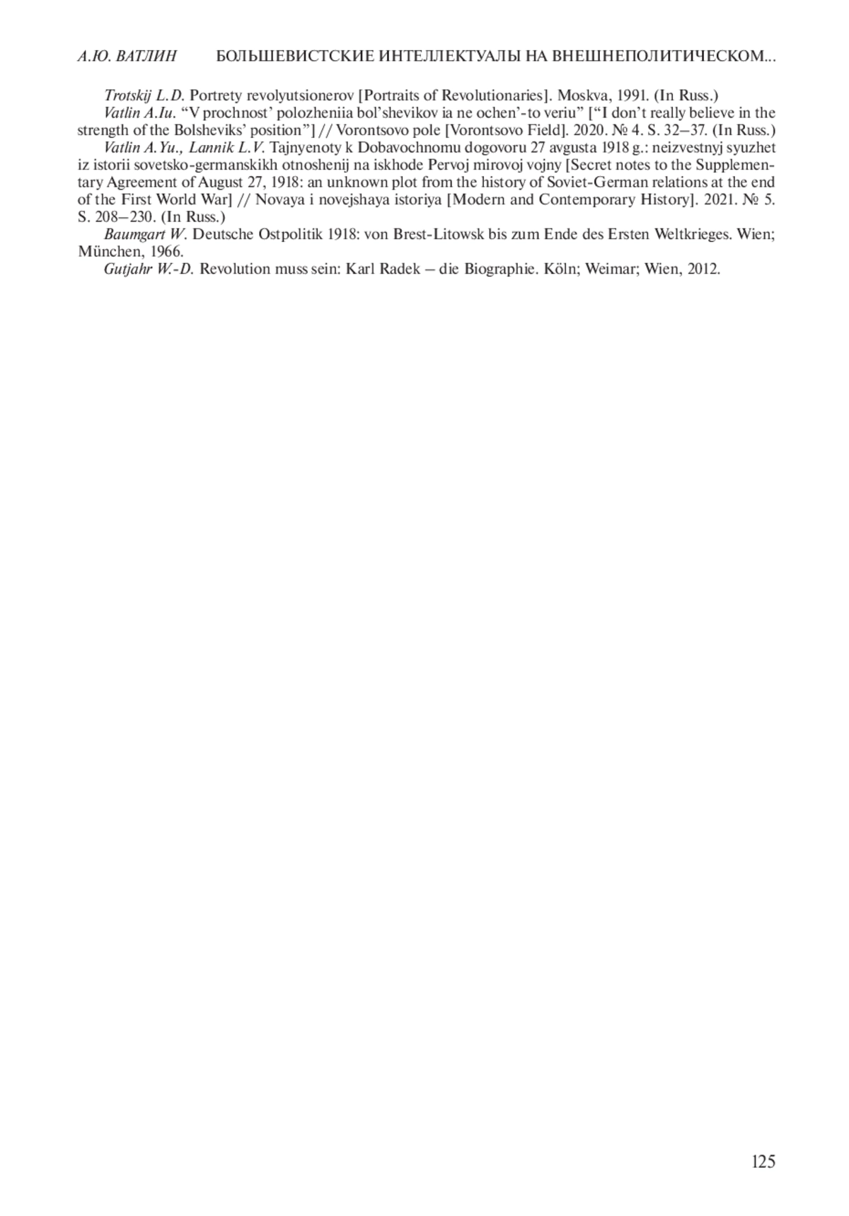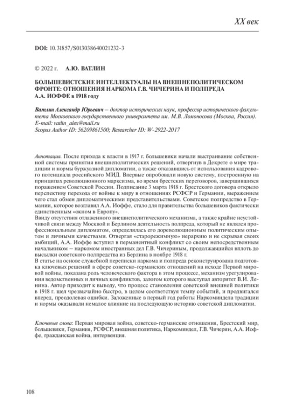 2. Ватлин А.Ю. “В прочность положения большевиков я не оченьто верю” // Воронцово поле. 2020. № 4. С. 32-37.