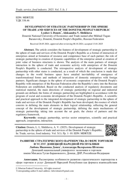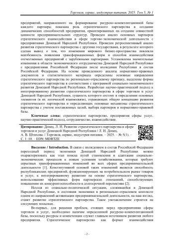 Рассмотрены особенности развития стратегического партнерства в сфере торговли и услуг Донецкой Народной Республики как формата взаимодействия предприятий, направленного на формирование ресурсно-компетентционной базы каждого партнера; показана роль стратегического партнерства в создании динамических способностей предприятия, ориентированных на создание совместной ценности предпринимательских структур. Проведен анализ основных партнеров стратегического взаимодействия в сфере торгово-экономической деятельности с предприятиями Донецкой Народной Республики. Проведен ретроспективный анализ развития стратегического партнерства с другими государствами, в результате которого сделан вывод о том, что изменения мирового бизнес-пространства повлекли неизбежность появления трансформационных форм и способов взаимодействия отечественных предприятий с зарубежными партнерами. Установлены значительные изменения в области экономического сотрудничества Донецкой Народной Республики с предприятиями Российской Федерации после вхождения Республики в состав Российской Федерации. На основе проведенного анализа нормативно-правовых документов и статистического материала определены основные направления стратегического партнерства по регионально-отраслевому признаку, выделены формы стратегического партнерства в соответствии с программой социально-экономического развития Донецкой Народной Республики. Разработан научно-практический подход к интегрированному развитию стратегического партнерства в сфере торговли и услуг Донецкой Народной Республики, сущность которого состоит в определении основных элементов (в их логической взаимосвязи), отражающих общую концепцию развития стратегического партнерства и определяющих основные механизмы стратегического партнерства с учетом поставленных целей, выбора партнеров и нормативно-правовой базы.