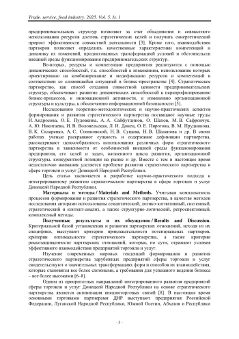 В связи с вхождением в состав Российской Федерации переходный период экономики Донецкой Народной Республики можно охарактеризовать как этап поиска путей становления и адаптации социальноэкономических процессов к новым условиям хозяйствования, которые требуют серьезных трансформационных изменений во всех сферах предпринимательской деятельности [1]. Конститутивной основой таких изменений является способность республиканских предприятий, функционирующих на потребительском рынке товаров и услуг, к интегрированному развитию на основе стратегического партнерства, использованию эффективных форм партнерских отношений, способствующих повышению их конкурентоспособности в долгосрочной перспективе [2].