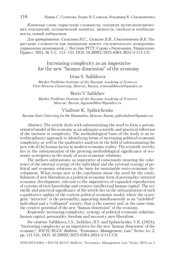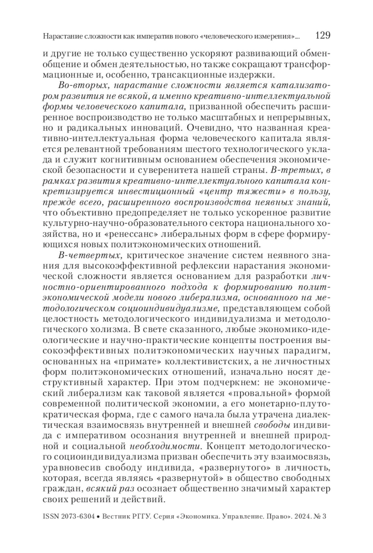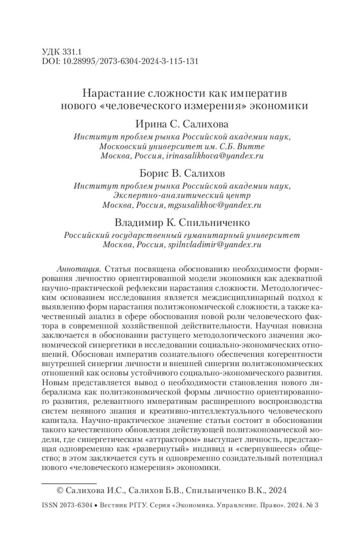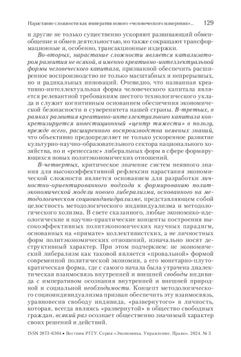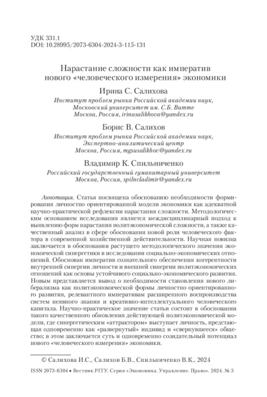 Статья посвящена обоснованию необходимости формирования личностно ориентированной модели экономики как адекватной научно-практической рефлексии нарастания сложности. Методологическим основанием исследования является междисциплинарный подход к выявлению форм нарастания политэкономической сложности, а также качественный анализ в сфере обоснования новой роли человеческого фактора в современной хозяйственной действительности. Научная новизна заключается в обосновании растущего методологического значения экономической синергетики в исследовании социально-экономических отношений. Обоснован императив сознательного обеспечения когерентности внутренней синергии личности и внешней синергии политэкономических отношений как основы устойчивого социально-экономического развития. Новым представляется вывод о необходимости становления нового либерализма как политэкономической формы личностно ориентированного развития, релевантного императивам расширенного воспроизводства систем неявного знания и креативно-интеллектуального человеческого капитала. Научно-практическое значение статьи состоит в обосновании такого качественного обновления действующей политэкономической модели, где синергетическим «аттрактором» выступает личность, предстающая одновременно как «развернутый» индивид и «свернувшееся» общество; в этом заключается суть и одновременно созидательный потенциал нового «человеческого измерения» экономики.