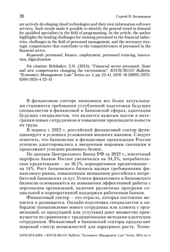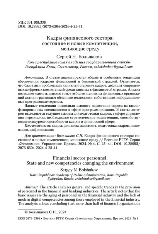 В статье анализируются общие и особенные тенденции обеспечения кадрами финансовой и банковской отраслей. Отмечается, что базовыми проблемами являются старение кадров, дефицит современных цифровых компетенций среди занятых в финансовой отрасли. Анализ позволяет сделать вывод о том, что более половины финансовых организаций активно развивают облачные технологии, собственные информационные программные сервисы. Данные тенденции позволили выявить нарастание спроса на квалифицированных специалистов в сфере программирования. В статье автором выделяются ведущие вызовы для подготовки кадров, в сфере управления персоналом, необходимые стратегические компетенции, способствующие конкурентоспособности кадров в финансовой сфере.