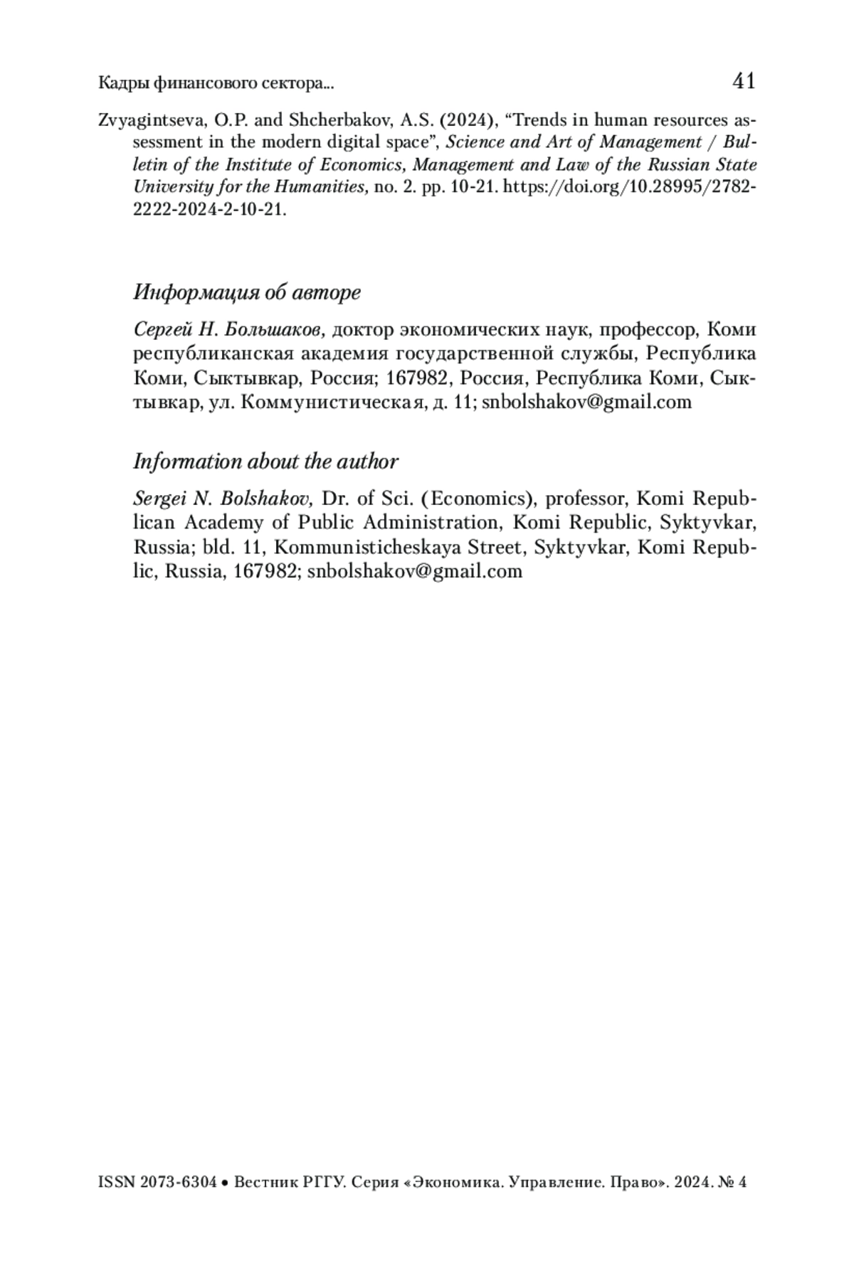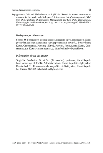 5. Звягинцева, Щербаков 2024 - Звягинцева О.П., Щербаков А.С. Тренды оценки человеческих ресурсов в современном цифровом пространстве // Наука и искусство управления. 2024. № 2. С. 10-21. https://doi.org/10.28995/2782-2222-2024-2-10-21.