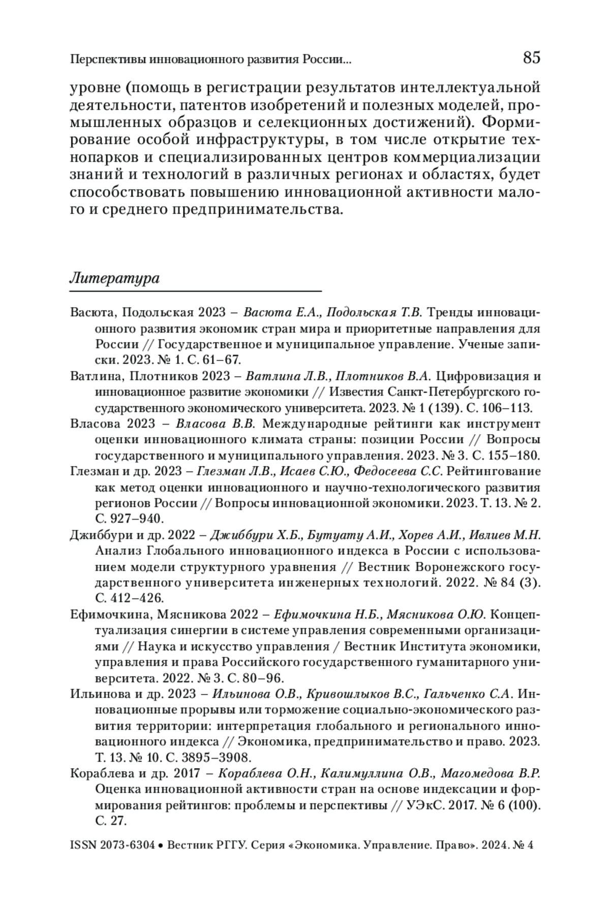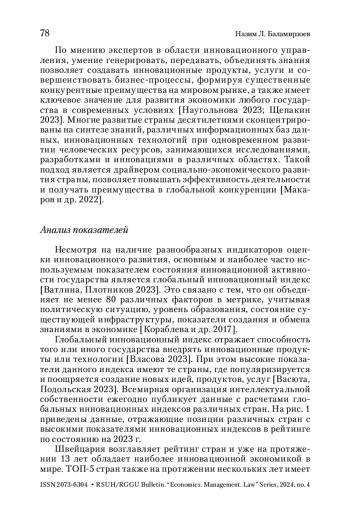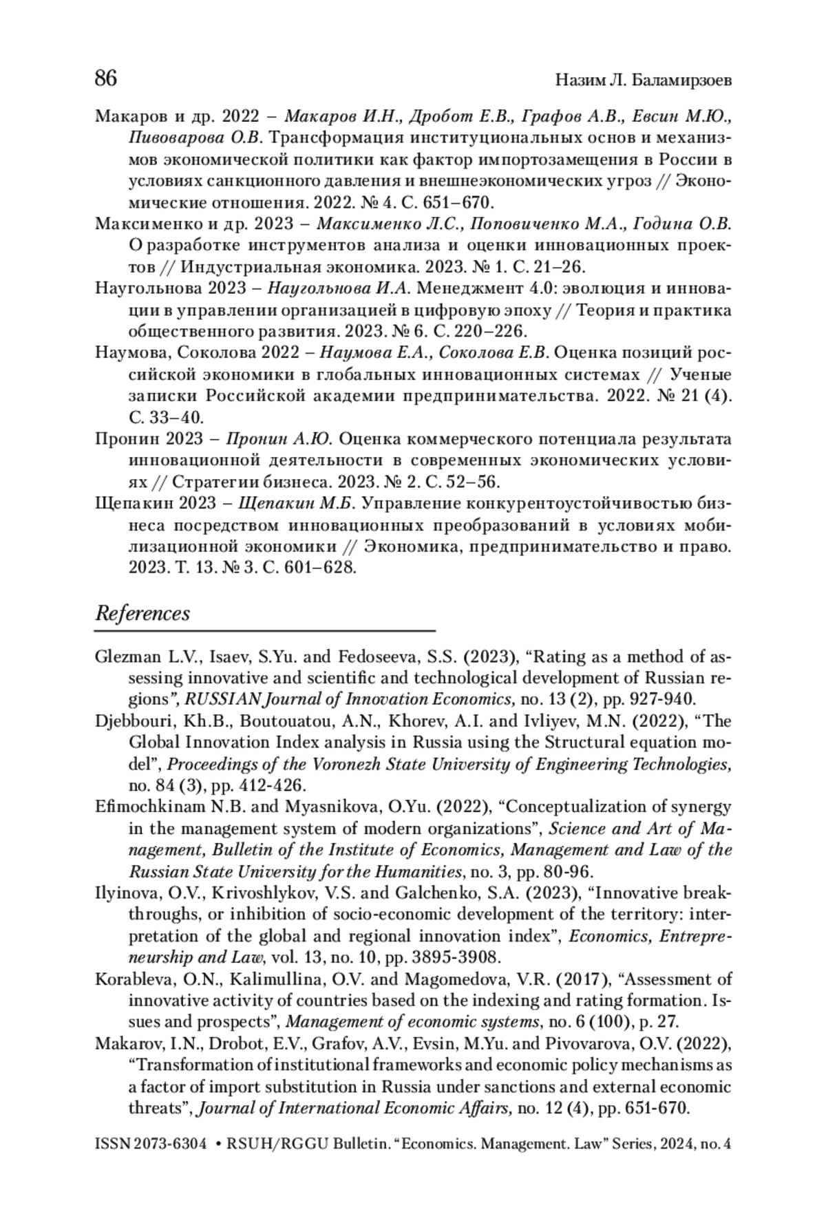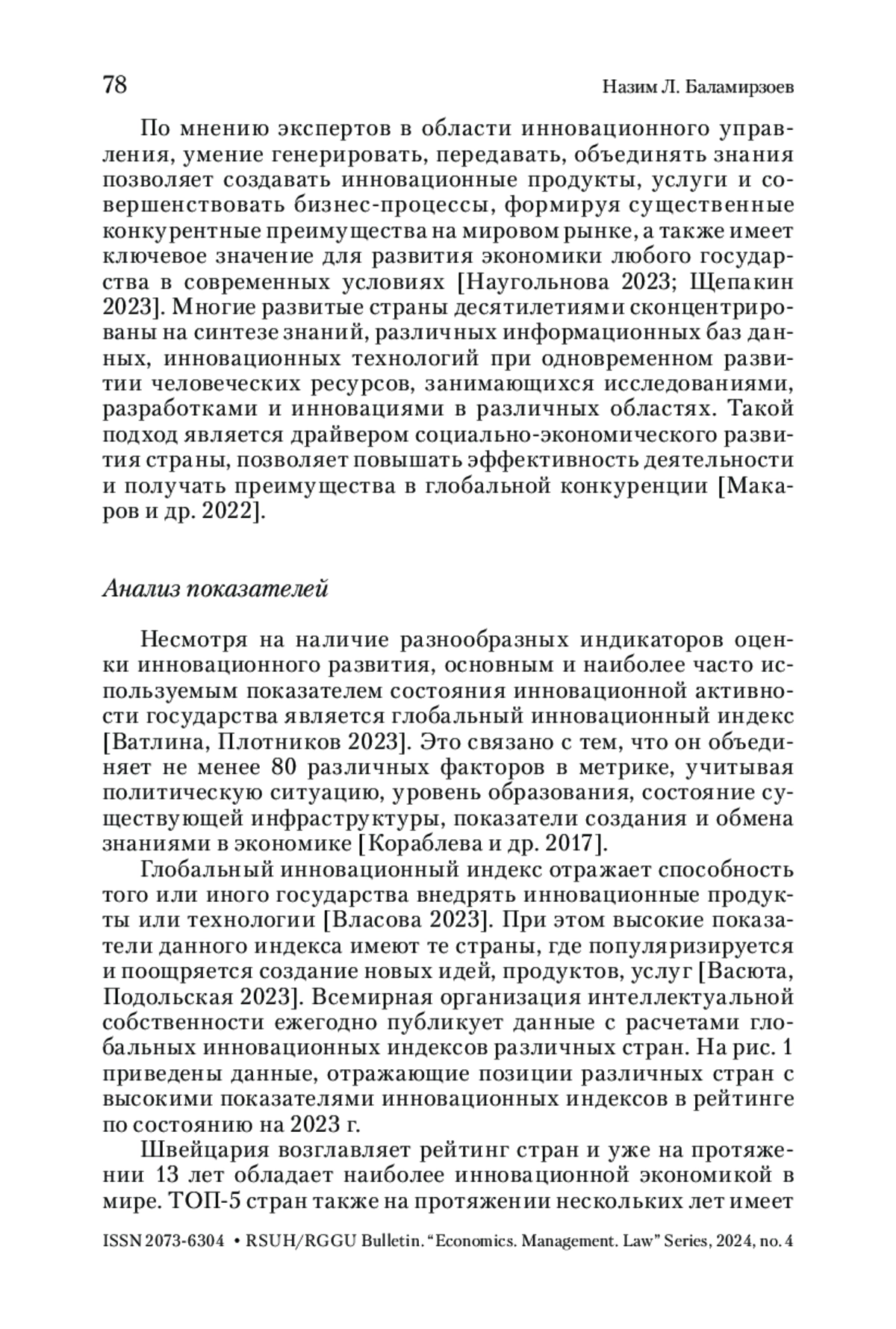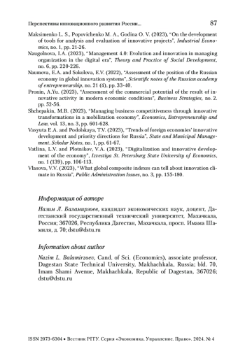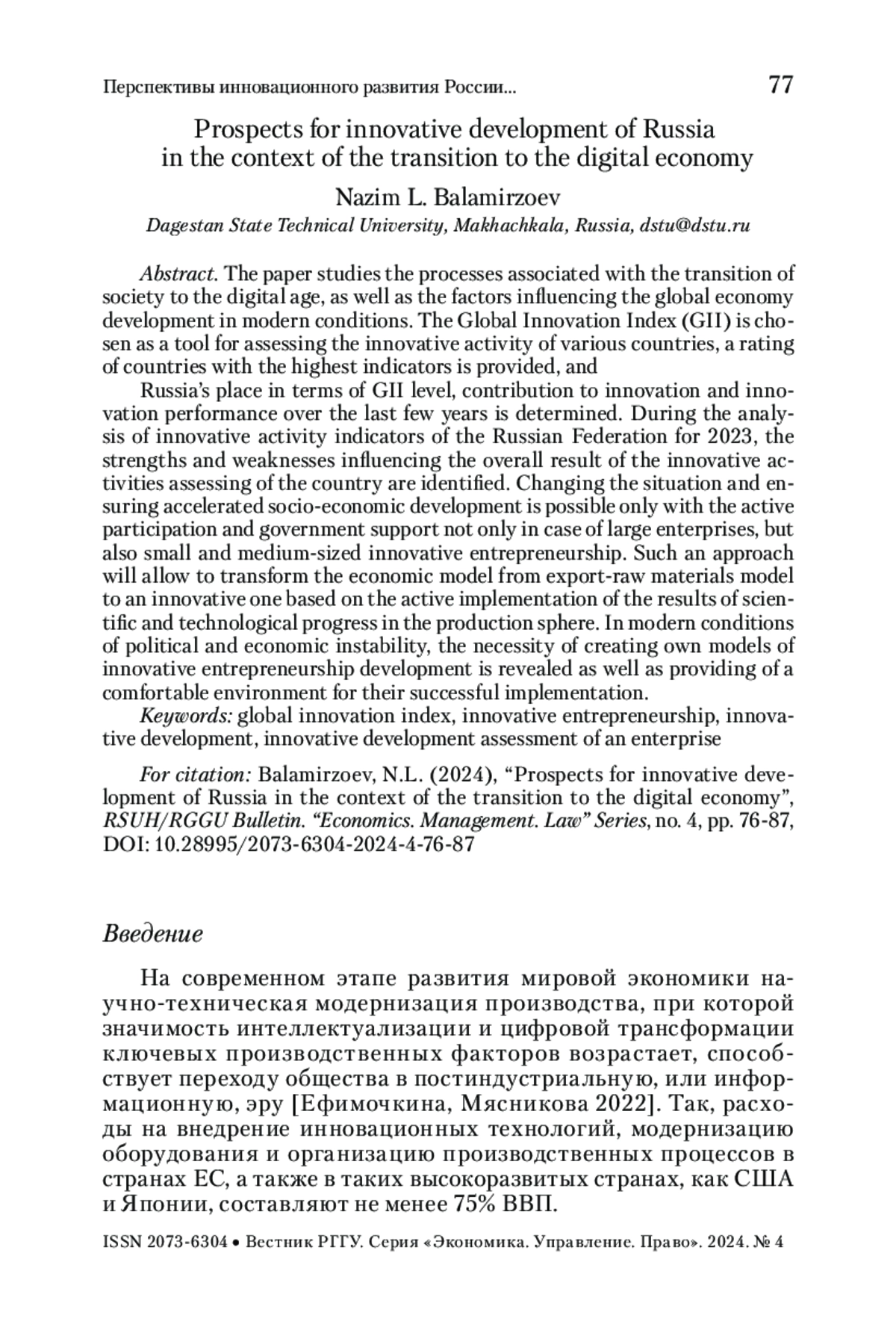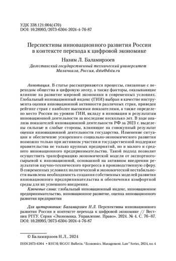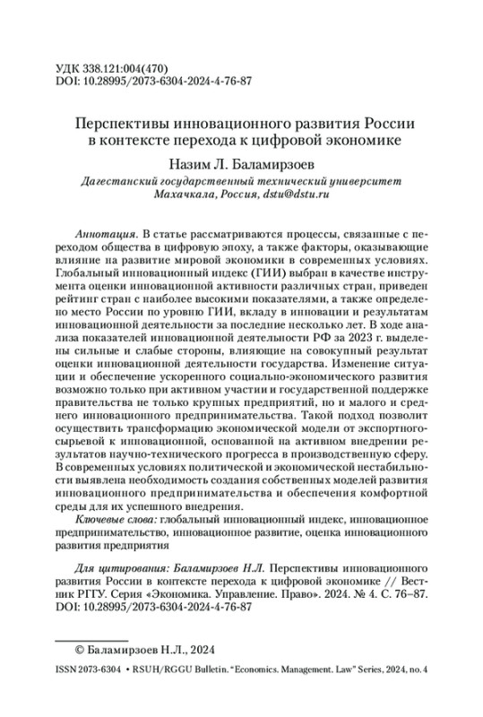 БАЛАМИРЗОЕВ Н. Л. ПЕРСПЕКТИВЫ ИННОВАЦИОННОГО РАЗВИТИЯ РОССИИ В КОНТЕКСТЕ ПЕРЕХОДА К ЦИФРОВОЙ ЭКОНОМИКЕ // ВЕСТНИК РГГУ. СЕРИЯ: ЭКОНОМИКА. УПРАВЛЕНИЕ. ПРАВО. 2024. № 4