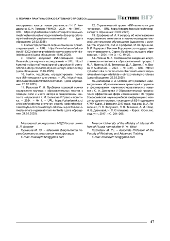 7. Кондрахина Н. Г Использование возможностей искусственного интеллекта для преподавания иностранных языков: новая реальность / Н. Г. Кондрахина, О. Н. Петрова // МНКО. - 2024. - № 1(104). -URL: https://cyberleninka.ru/article/n/ispolzovanie-voz-mozhnostey-iskusstvennogo- intellekta-dlya-prepodava-niya-inostrannyh-yazykov-novaya-realnost (дата обращения: 23.02.2025).
