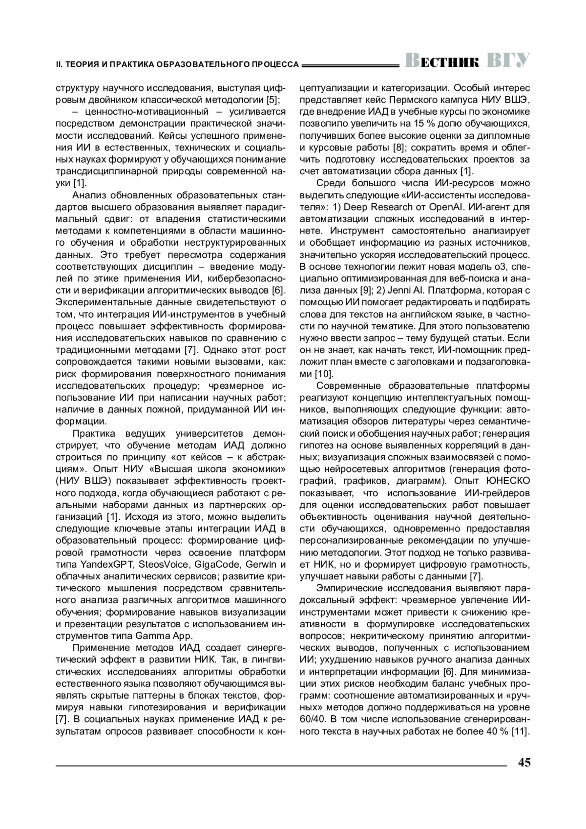 Рассматривается инновационный подход к развитию научно-исследовательской компетентности обучающихся посредством интеграции технологий искусственного интеллекта (ИИ) в образовательный процесс. Показаны преимущества применения ИИ-инструментов в обучении: повышение эффективности формирования исследовательских навыков, развитие критического мышления, возможность персонализации образовательных траекторий. Вместе с тем отмечены потенциальные риски чрезмерного использования ИИ, такие как снижение креативности и критического восприятия информации.