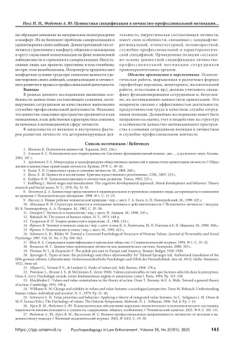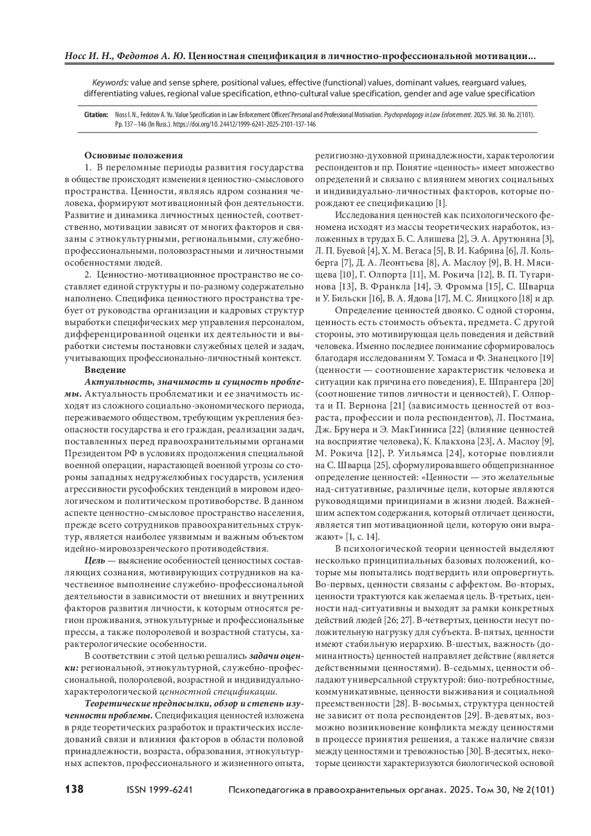 НОСС И. Н., ФЕДОТОВ А. Ю. ЦЕННОСТНАЯ СПЕЦИФИКАЦИЯ В ЛИЧНОСТНО-ПРОФЕССИОНАЛЬНОЙ МОТИВАЦИИ СОТРУДНИКОВ ПРАВООХРАНИТЕЛЬНЫХ ОРГАНОВ // ПСИХОПЕДАГОГИКА В ПРАВООХРАНИТЕЛЬНЫХ ОРГАНАХ. 2025. № 2 (101), ТОМ 30