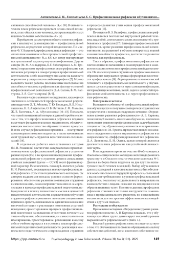 Рассматриваются психологические характеристики профессиональной рефлексии обучающихся профессиональных образовательных организаций — будущих специалистов среднего звена. Цель — выявление психологических особенностей профессиональной рефлексии обучающихся профессиональных образовательных организаций. Материалы и методы. В исследовании использовались следующие методики: «Определение уровня развития рефлексивности» А. В. Карпова, «Уровень выраженности и направленности рефлексии» М. Гранта, «Дифференцированный тип рефлексии» Д. А. Леонтьева, Е. Н. Осина. Выборку составили 40 обучающихся профессиональных образовательных организаций. Результаты и обсуждение. Выделяются психологические характеристики профессиональной рефлексии обучающихся медицинского и педагогического колледжей, определяющие их представление о себе как будущем профессионале. Приводятся данные анализа категории «профессиональная рефлексия», а также результаты сравнительного анализа особенностей профессиональной рефлексии обучающихся, полученные нами в процессе эмпирического исследования. Выводы. Профессиональная рефлексия обучающихся профессиональных образовательных организаций имеет особенности, к которым можно отнести способность анализировать и оценивать свои «шаги» в профессию, умение сопереживать и проникать во внутренний мир другого человека, проявлять эмпатию, толерантность, чуткость, способность осознавать и осмысливать свои переживания по поводу вхождения в профессию, прогнозировать последствия собственных профессиональных действий.