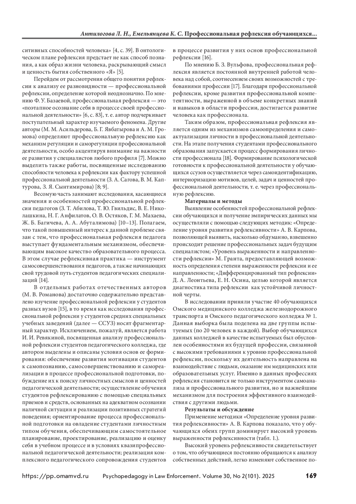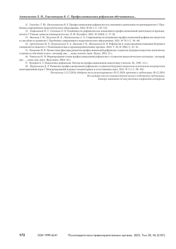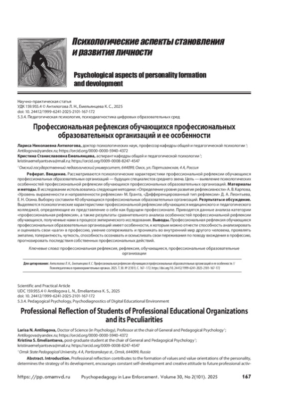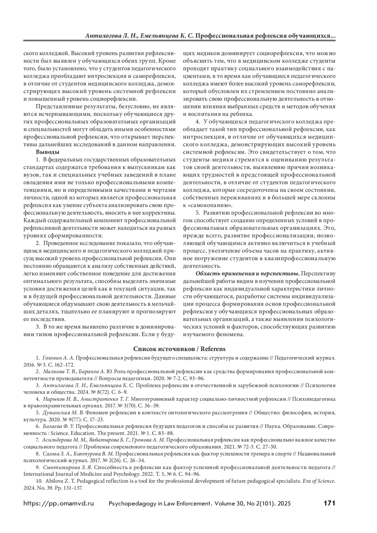 АНТИЛОГОВА Л. Н., ЕМЕЛЬЯНЦЕВА К. С. ПРОФЕССИОНАЛЬНАЯ РЕФЛЕКСИЯ ОБУЧАЮЩИХСЯ ПРОФЕССИОНАЛЬНЫХ ОБРАЗОВАТЕЛЬНЫХ ОРГАНИЗАЦИЙ И ЕЕ ОСОБЕННОСТИ // ПСИХОПЕДАГОГИКА В ПРАВООХРАНИТЕЛЬНЫХ ОРГАНАХ. 2025. № 2 (101), ТОМ 30