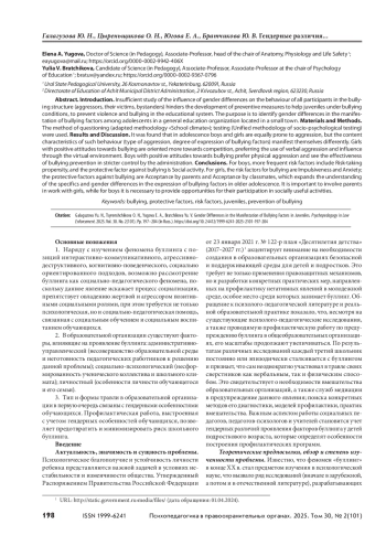 Недостаточная изученность влияния гендерных различий на поведение всех участников буллингструктуры (агрессоров, их жертв, сторонних наблюдателей) сдерживает разработку профилактических мер, призванных оказать помощь подросткам в условиях буллинга, предупредить насилие и травлю в системе образования. Цель — определение гендерных различий проявления факторов буллинга у подростков в общеобразовательной организации, в условиях малого города. Материалы и методы. Для реализации поставленной цели использовались методы анкетирования (адаптированная методика «Школьный климат») и тестирования (Единая методика социально-психологического тестирования). Результаты и обсуждение. В подростковом возрасте юноши и девушки одинаково склонны к проявлению агрессии, однако содержательные характеристики такого поведения (вид агрессии, степень выраженности факторов буллинга) проявляются по-разному. Девочки с позитивными установками в отношении буллинга ориентированы в большей степени на соперничество, применяя вербальную агрессию, воздействие через виртуальную среду. Юноши с позитивными установками в отношении буллинга предпочитают физическую агрессию, видят результативность профилактики буллинга в ужесточении контроля со стороны администрации. Выводы. Для юношей фактором риска чаще является склонность к риску, фактором защиты от буллинга — социальная активность. Для девушек факторами риска возникновения буллинга выступают импульсивность и тревожность; факторами защиты от буллинга — принятие родителями и принятие одноклассниками, что расширяет представление о специфике и гендерных различиях выраженности факторов буллинга в старшем подростковом возрасте. Результаты опытно-поисковой деятельности позволяют выработать стратегии первичной профилактики с учетом гендерных различий: к работе с девушками важно подключать родителей, а для юношей необходимо организовать возможность их участия в общественно полезных делах.