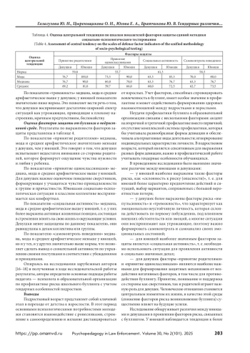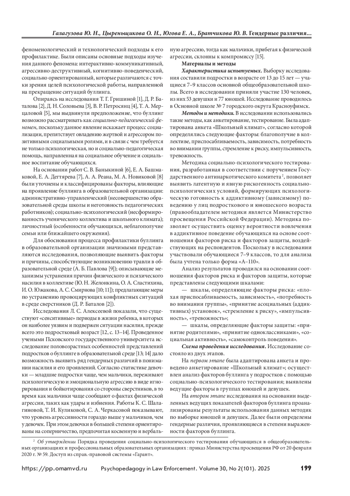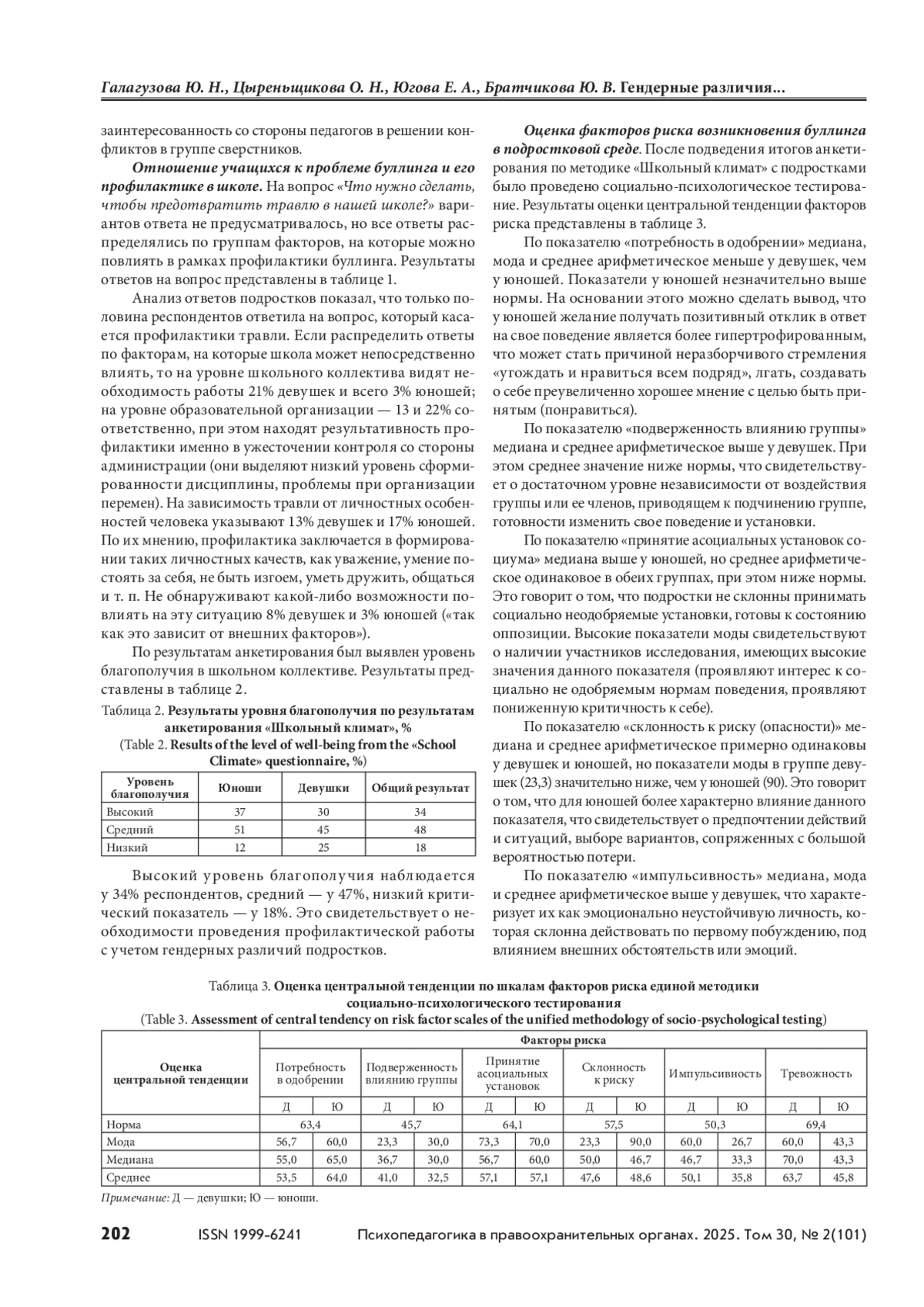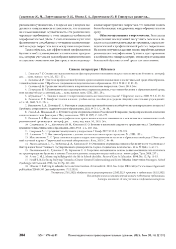 ГАЛАГУЗОВА Ю. Н., ЦЫРЕНЬЩИКОВА О. Н., ЮГОВА Е. А., БРАТЧИКОВА Ю. В. ГЕНДЕРНЫЕ РАЗЛИЧИЯ ПРОЯВЛЕНИЯ ФАКТОРОВ БУЛЛИНГА У ПОДРОСТКОВ // ПСИХОПЕДАГОГИКА В ПРАВООХРАНИТЕЛЬНЫХ ОРГАНАХ. 2025. № 2 (101), ТОМ 30