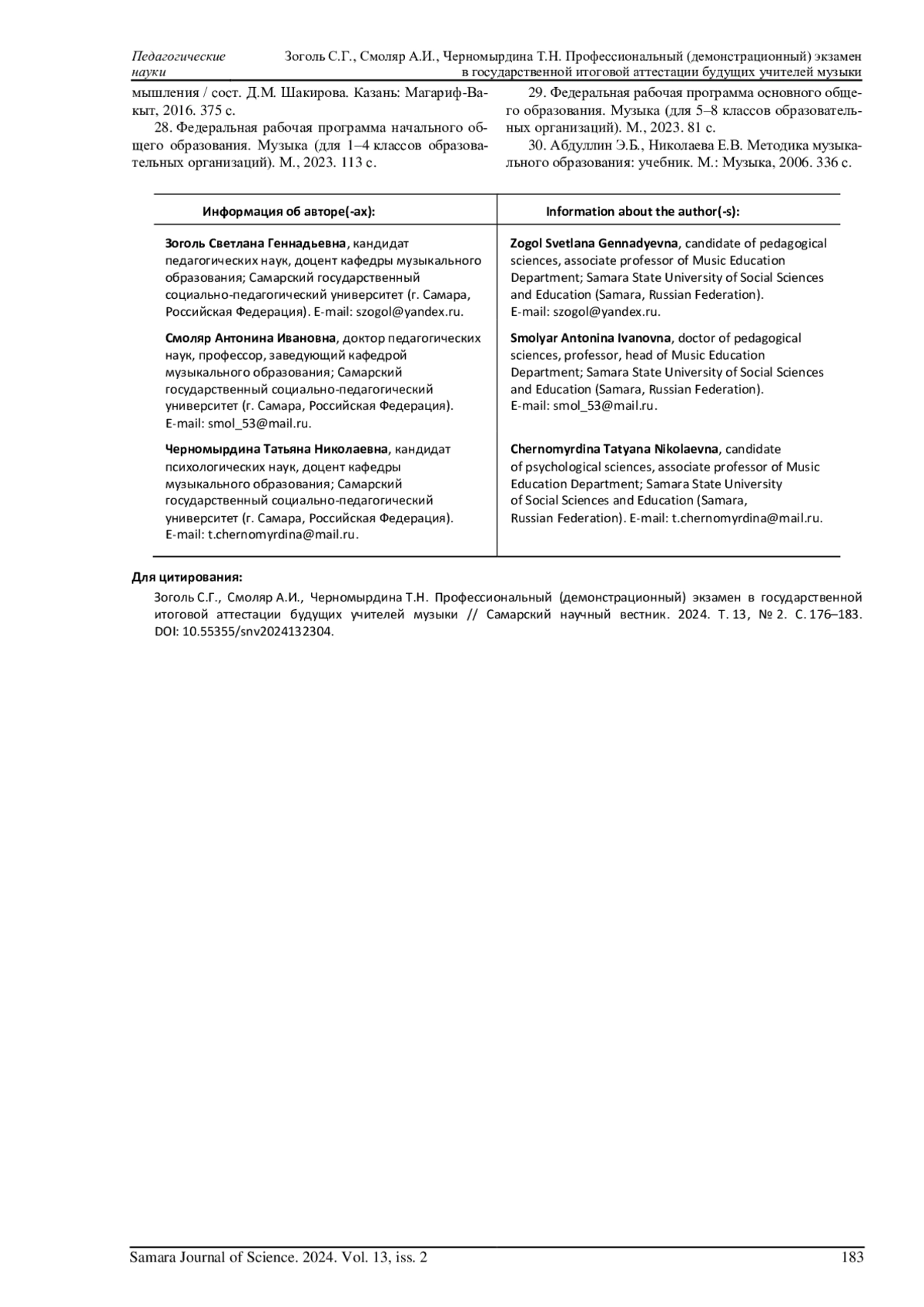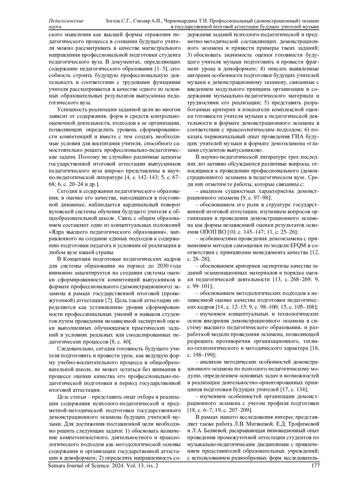 19. Матвеева Л.В., Трофимова Е.Д., Беляева Л.А. Инновационные формы промежуточной аттестации обучающихся педагогических вузов по музыкально-педагогическим дисциплинам в условиях подготовки к государственному демонстрационному экзамену // Педагогическое образование в России. 2024. № 2. С. 202-211. EDN: AUUANE
