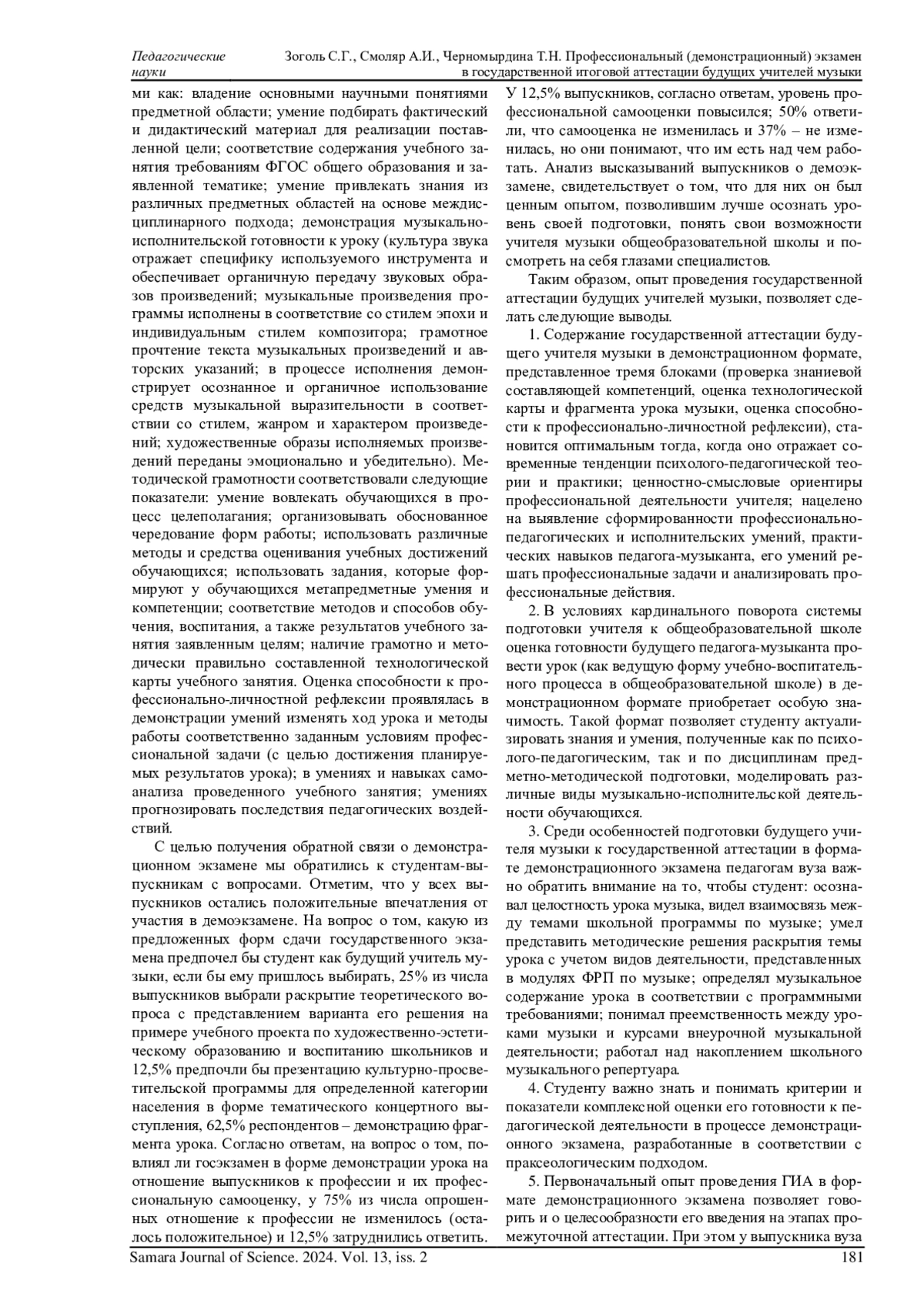 На основе анализа научно-педагогической литературы и нормативно-правовых документов в сфере образования обоснована актуальность изложения и анализа накопленного на кафедре музыкального образования СГСПУ опыта отбора и реализации содержания психолого-педагогической, методической и музыкально-исполнительской подготовки государственного экзамена будущих учителей музыки в формате профессионального (демонстрационного). В соответствии с целью исследования определена методологическая основа содержания и организации государственной аттестации. Авторы акцентируют внимание на том, что праксеологический подход направляет на полноту и рациональность решения поставленной задачи, эффективность использования отведенного на выполнение задания времени, учет возрастных и индивидуальных особенностей обучающихся. Его назначение находит отражение в разработанных критериях и показателях комплексной оценки готовности учителя музыки к педагогической деятельности (через оценку технологической карты, фрагмента урока и его анализа). Авторами определена направленность содержания заданий психолого-педагогической, методической и музыкально-исполнительской составляющих демонстрационного экзамена и приведены примеры таких заданий. В статье обоснована значимость (приведены аргументы) оценки готовности будущего учителя музыки подготовить, провести фрагмент урока в демоформате и проанализировать его; выявлены и представлены особенности подготовки будущих учителей музыки к демонстрационному экзамену, связанные с введением модульного принципа организации и содержания музыкально-педагогического материала и трудностями его реализации; представлен первоначальный опыт проведения ГИА будущего учителя музыки в формате демоэкзамена «глазами студентов-выпускников».