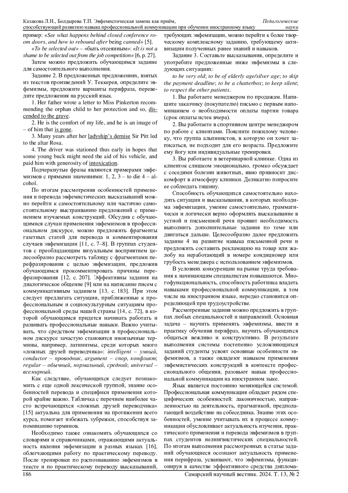 В статье рассматриваются особенности лексической группы эвфемизмов и возможности их применения в процессе развития навыка профессиональной коммуникации на занятиях по иностранному языку в учреждениях высшего образования. Цель статьи - описать апробированные на практике методические задания, эффективные для изучения рассматриваемой лексической группы и аргументировать эффективность применения эвфемизмов для расширения активного лексического запаса. В статье обосновывается актуальность изучения разных лексических групп студентами нелингвистических специальностей: общепрофессиональные термины, узкоспециальные термины, эвфемизмы, онимы и некоторые другие. Особое внимание уделяется эвфемизмам в связи с актуальностью их применения для развития профессиональной коммуникации и решения профессиональных задач на иностранном языке. Способность осознанно осуществлять перефразирование, смягчая критические замечания, вводить иные конструкции, изменяя стиль общения, преследуя выраженную коммуникативную задачу, отражает высокий уровень развития необходимых компетенций. Как следствие, рассмотрение особенностей группы эвфемизмов представляет непосредственный интерес для овладения навыком профессиональной коммуникации. Способность обучающихся самостоятельно находить ситуации и высказывания, в которых необходима эвфемизации, умение самостоятельно, грамматически и логически верно оформлять высказывание в устной и письменной речи проявит эффективность учебных занятий.