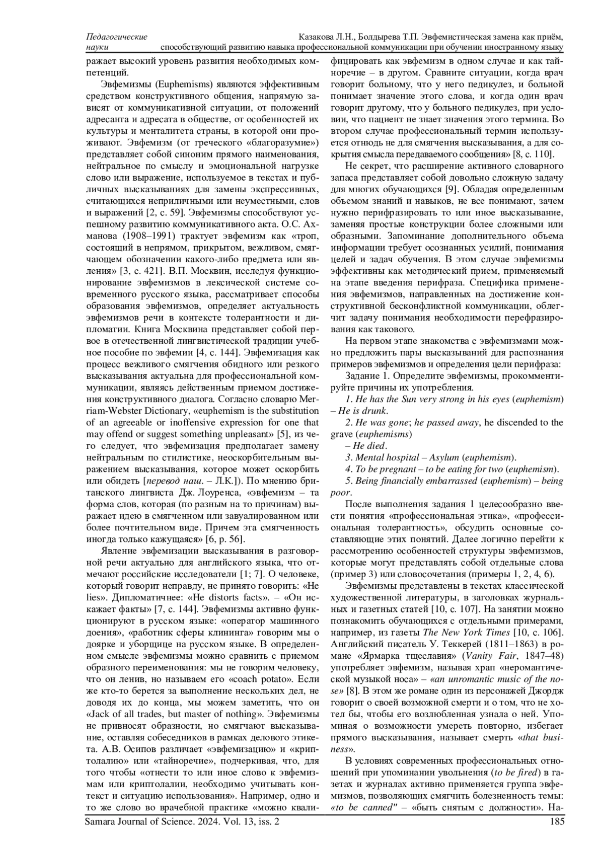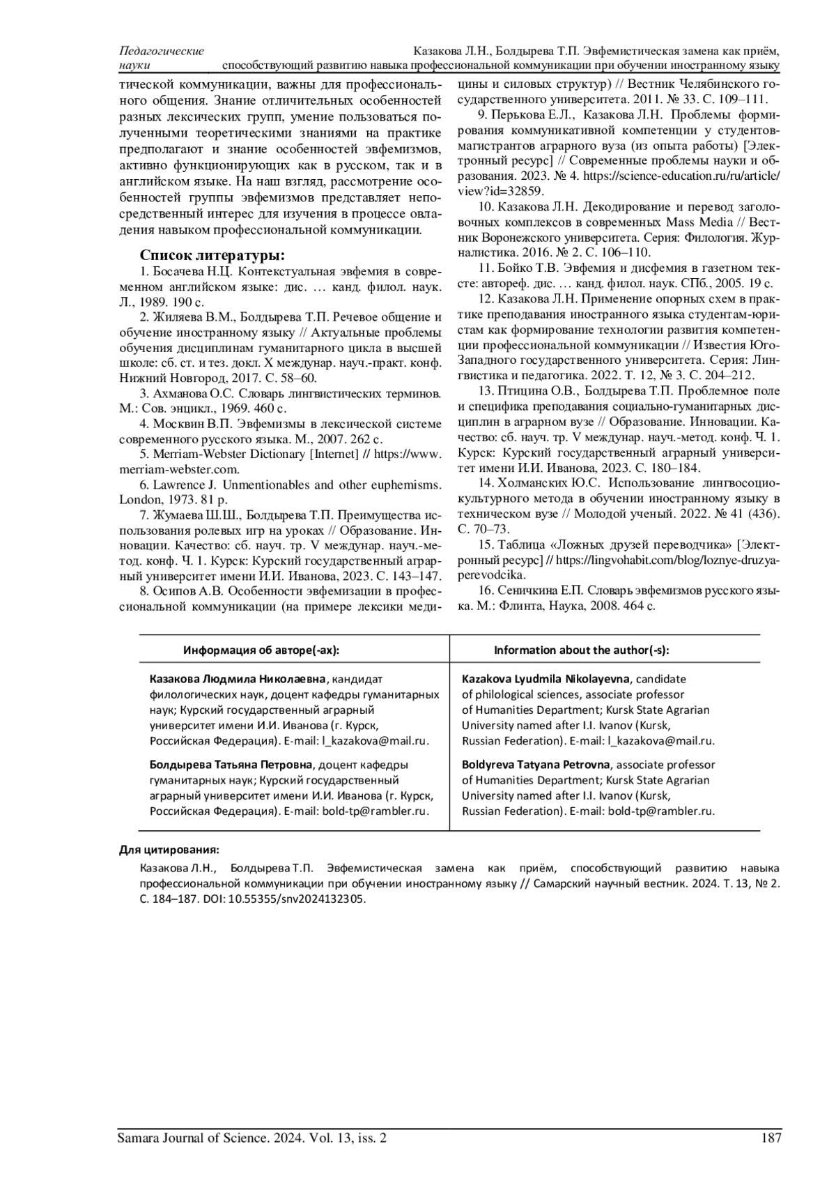 12. Казакова Л.Н. Применение опорных схем в практике преподавания иностранного языка студентам-юристам как формирование технологии развития компетенции профессиональной коммуникации // Известия Юго-Западного государственного университета. Серия: Лингвистика и педагогика. 2022. Т. 12, № 3. С. 204-212. EDN: MWGMOP