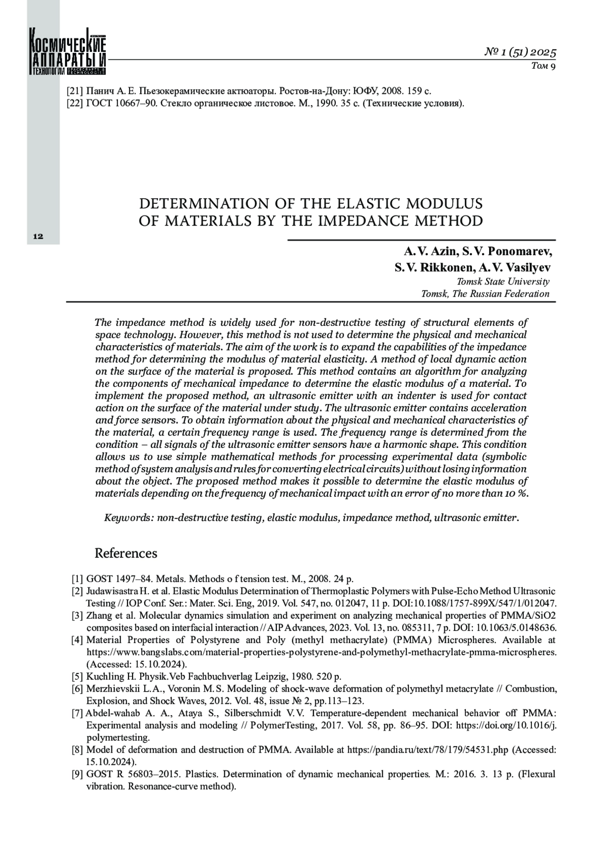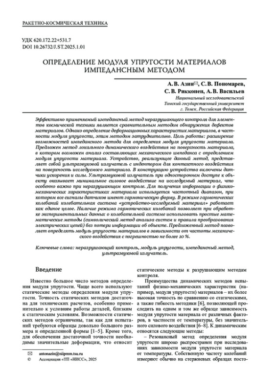 АЗИН А. В., ПОНОМАРЕВ С. В., РИККОНЕН С. В., ВАСИЛЬЕВ А. В. ОПРЕДЕЛЕНИЕ МОДУЛЯ УПРУГОСТИ МАТЕРИАЛОВ ИМПЕДАНСНЫМ МЕТОДОМ // КОСМИЧЕСКИЕ АППАРАТЫ И ТЕХНОЛОГИИ. 2025. № 1 (51), ТОМ 9
