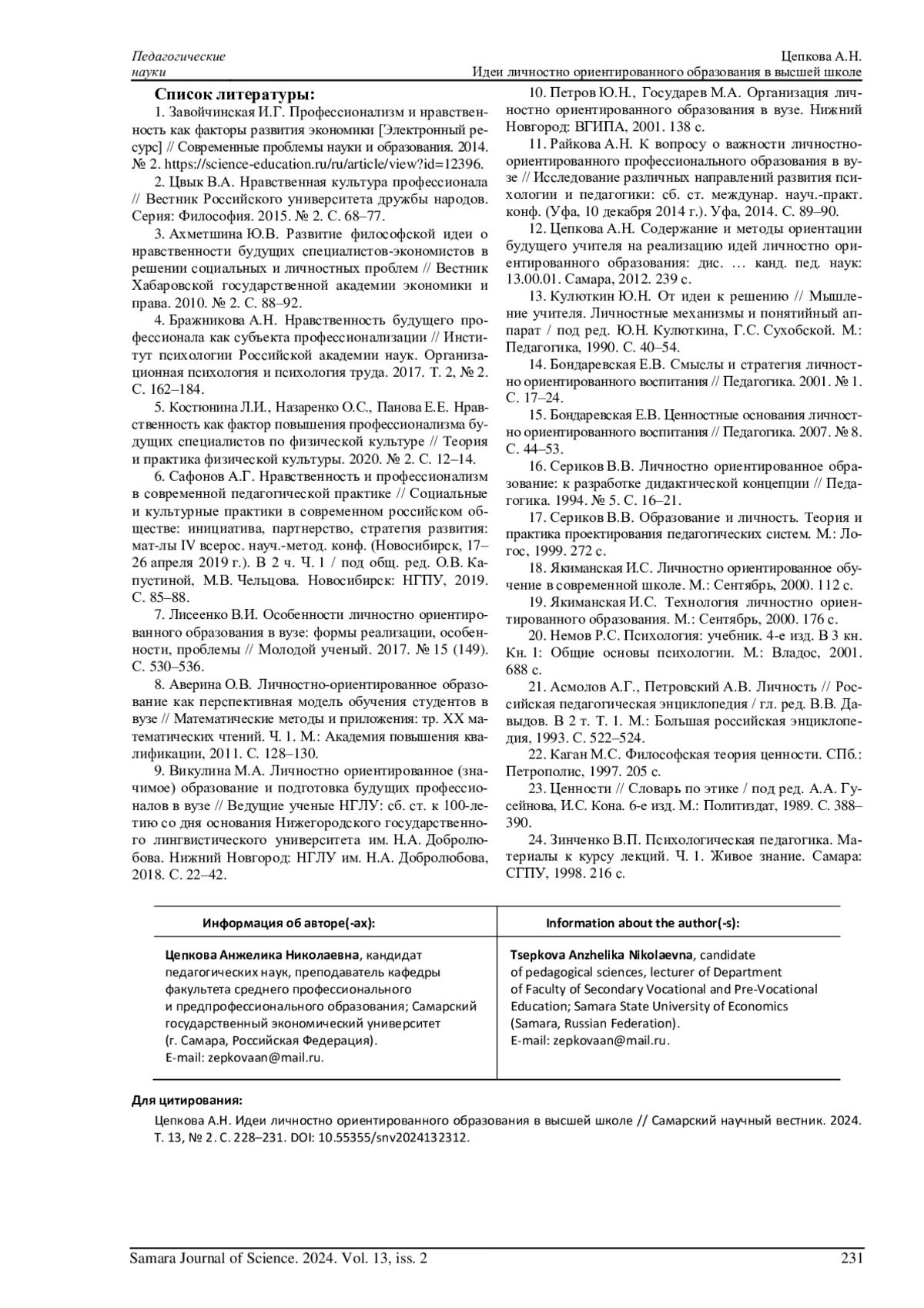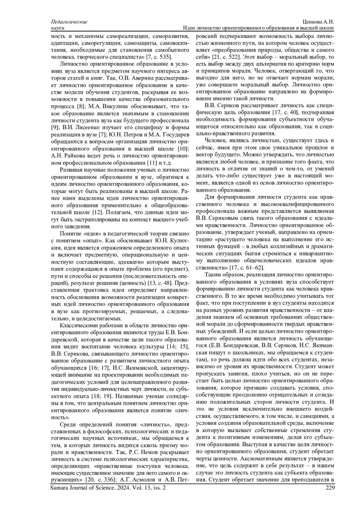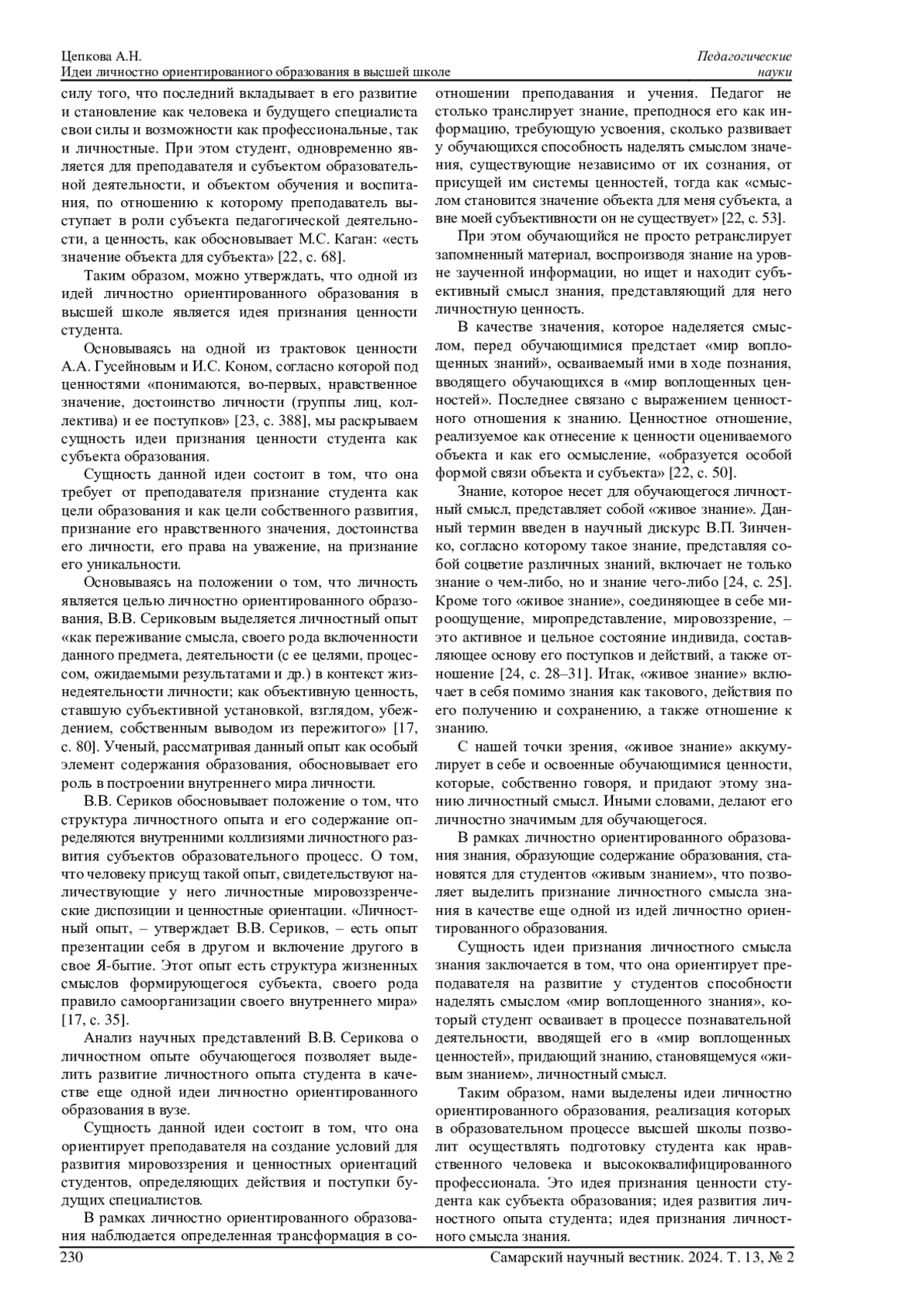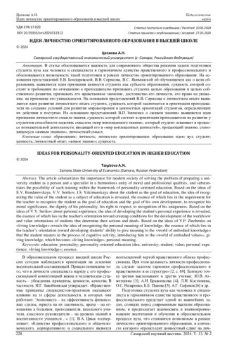 ЦЕПКОВА А. Н. ИДЕИ ЛИЧНОСТНО ОРИЕНТИРОВАННОГО ОБРАЗОВАНИЯ В ВЫСШЕЙ ШКОЛЕ // САМАРСКИЙ НАУЧНЫЙ ВЕСТНИК. 2024. ТОМ 13, № 2