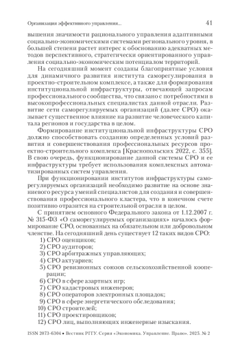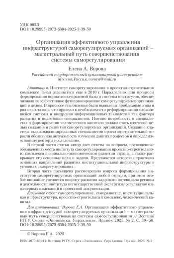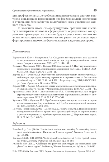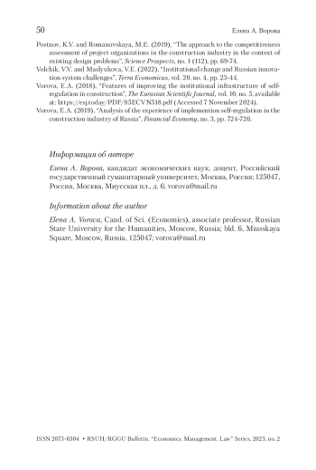 3. Ворова 2018 - Ворова Е.А. Особенности совершенствования институциональной инфраструктуры саморегулирования в строительстве // Вестник евразийской науки. 2018. T. 10. № 5. URL: https://esj.today/PDF/85ECVN518.pdf (дата обращения: 07 ноября 2024).