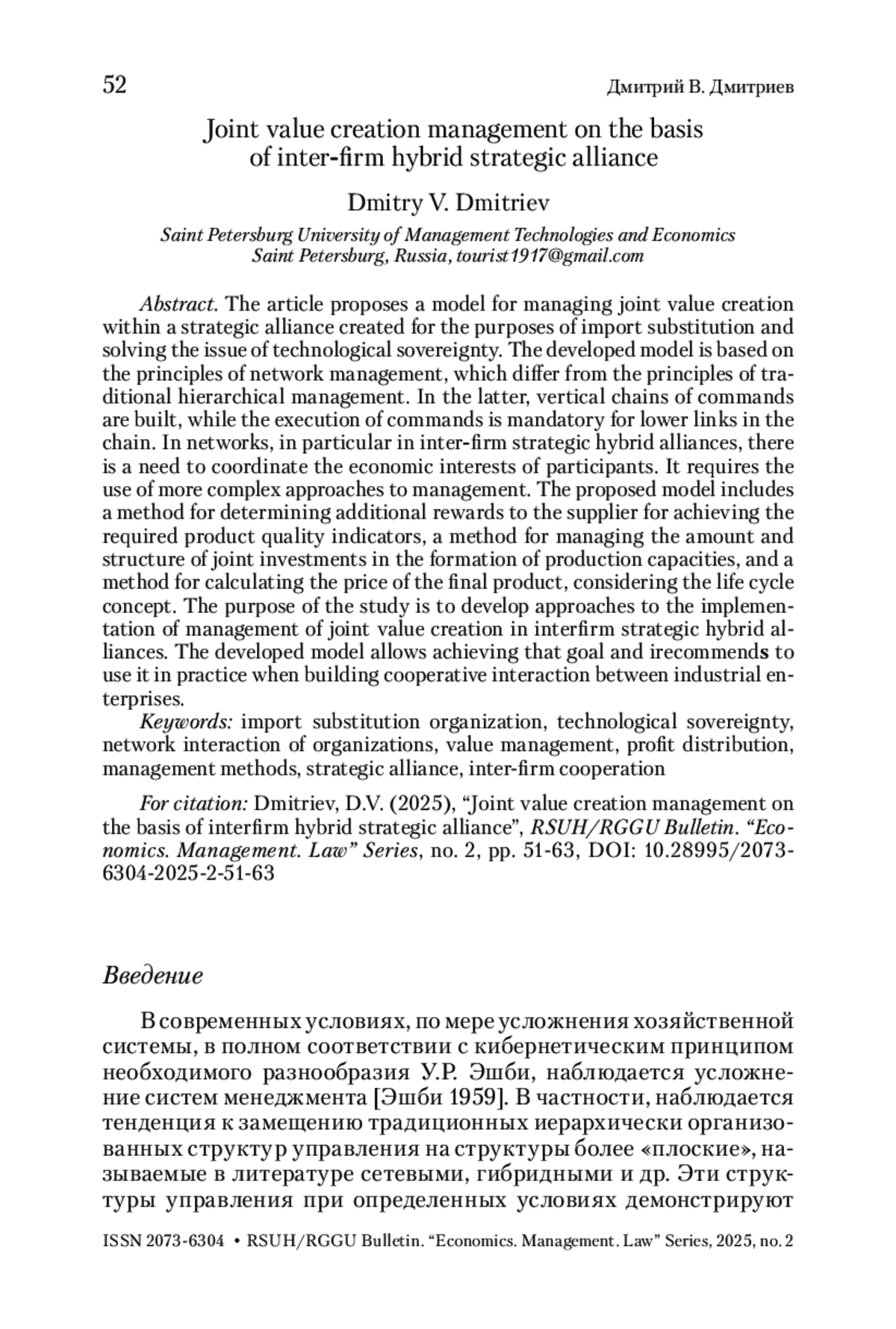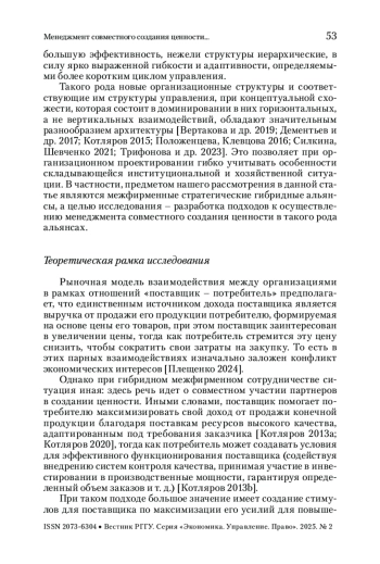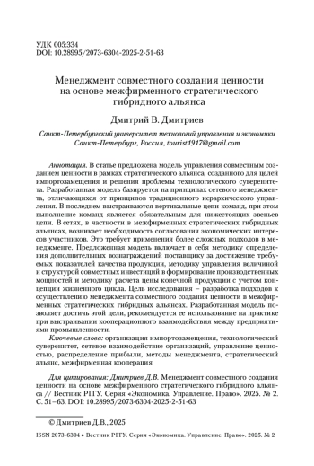 В статье предложена модель управления совместным созданием ценности в рамках стратегического альянса, созданного для целей импортозамещения и решения проблемы технологического суверенитета. Разработанная модель базируется на принципах сетевого менеджмента, отличающихся от принципов традиционного иерархического управления. В последнем выстраиваются вертикальные цепи команд, при этом выполнение команд является обязательным для нижестоящих звеньев цепи. В сетях, в частности в межфирменных стратегических гибридных альянсах, возникает необходимость согласования экономических интересов участников. Это требует применения более сложных подходов в менеджменте. Предложенная модель включает в себя методику определения дополнительных вознаграждений поставщику за достижение требуемых показателей качества продукции, методику управления величиной и структурой совместных инвестиций в формирование производственных мощностей и методику расчета цены конечной продукции с учетом концепции жизненного цикла. Цель исследования – разработка подходов к осуществлению менеджмента совместного создания ценности в межфирменных стратегических гибридных альянсах. Разработанная модель позволяет достичь этой цели, рекомендуется ее использование на практике при выстраивании кооперационного взаимодействия между предприятиями промышленности.