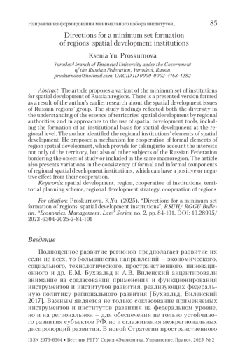 В статье предложен вариант минимального набора институтов пространственного развития российских регионов. Представленный вариант сформирован в результате проведенного ранее автором исследования проблем пространственного развития группы российских регионов. Результаты исследования отразили как разнообразие в понимании сущности пространственного развития территорий со стороны региональных властей, так и в подходах к использованию инструментов пространственного развития, в том числе в формировании институциональной базы пространственного развития на уровне региона. Автор определил составляющие региональных институтов пространственного развития. Предложен механизм взаимодействия формальных элементов пространственного развития региона, который предусматривает учет интересов в данной сфере не только данной территории, но и других субъектов РФ, граничащих с объектом исследования или входящих с ним в один макрорегион. Представлены вариации согласованности формальных и неформальных составляющих институтов пространственного развития региона, которые могут иметь положительный или отрицательный эффект от своего взаимодействия.