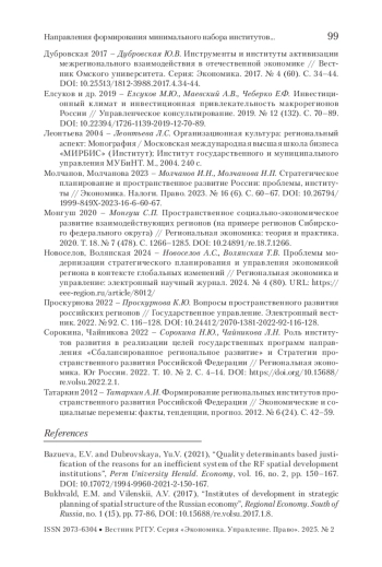 1. Базуева, Дубровская 2021 - Базуева Е.В., Дубровская Ю.В. Обоснование причин неэффективности системы институтов пространственного развития РФ в контексте параметров качества // Вестник Пермского университета. Сер. «Экономика». 2021. Т. 16. № 2. С. 150-167. https://doi.org/10.17072/1994-9960-2021-2-150-167.