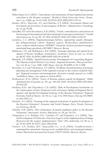 7. Дубровская 2017 - Дубровская Ю.В. Инструменты и институты активизации межрегионального взаимодействия в отечественной экономике // Вестник Омского университета. Серия: Экономика. 2017. № 4 (60). С. 34-44. https://doi.org/10.25513/1812-3988.2017.4.34-44.