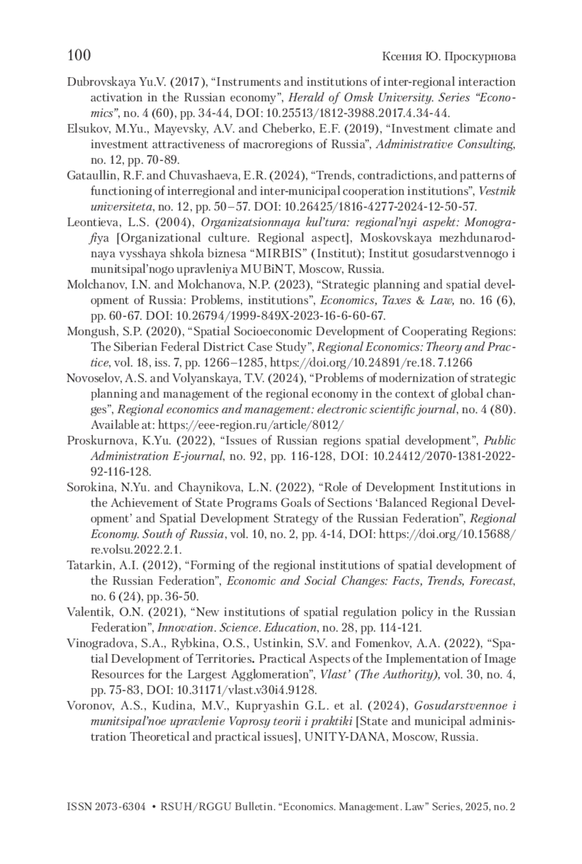 13. Проскурнова 2022 - Проскурнова К.Ю. Вопросы пространственного развития российских регионов // Государственное управление. Электронный вестник. 2022. № 92. С. 116-128. https://doi.org/10.24412/2070-1381-2022-92-116-128.