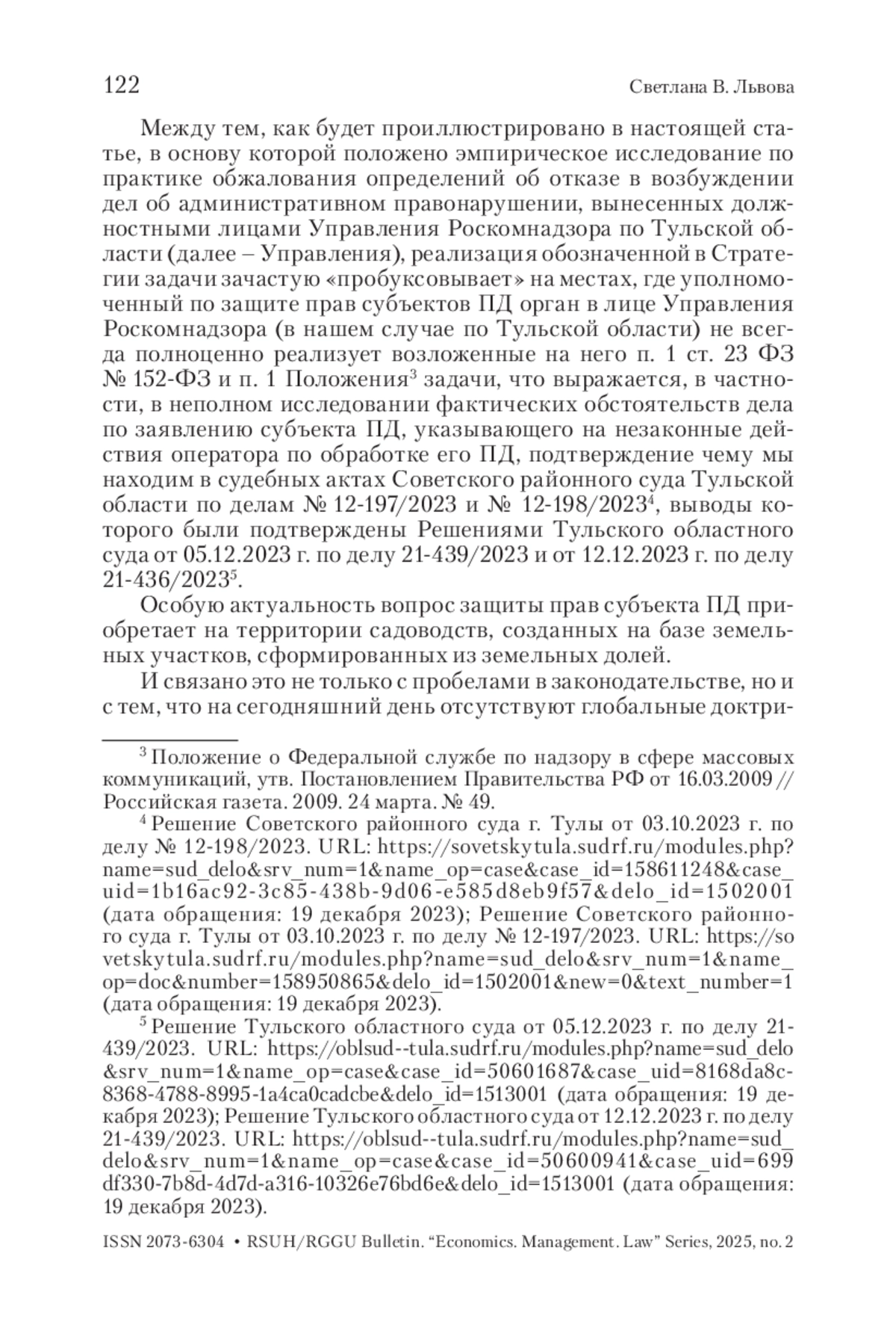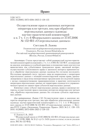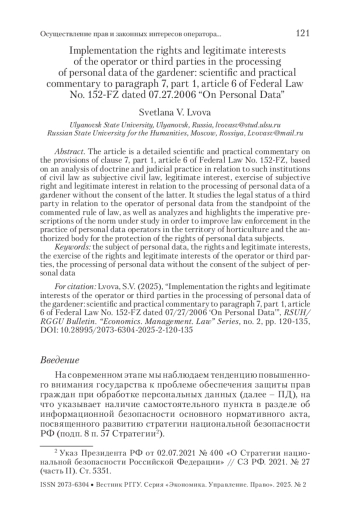 Статья представляет собой развернутый научно-практический комментарий положений п. 7 ч. 1 ст. 6 ФЗ № 152-ФЗ1, основанный на анализе доктрины и судебной практики в отношении таких институтов цивилистики, как субъективное гражданское право, законный интерес, осуществление субъективного права и законного интереса применительно к обработке персональных данных садовода без согласия последнего. Исследован правовой статус третьего лица во взаимосвязи с оператором персональных данных с позиций комментируемой нормы права, проанализированы и выделены императивные предписания исследуемой нормы с целью совершенствования правоприменения в практике деятельности операторов персональных данных на территории садоводств и управомоченного органа по защите прав субъектов персональных данных.