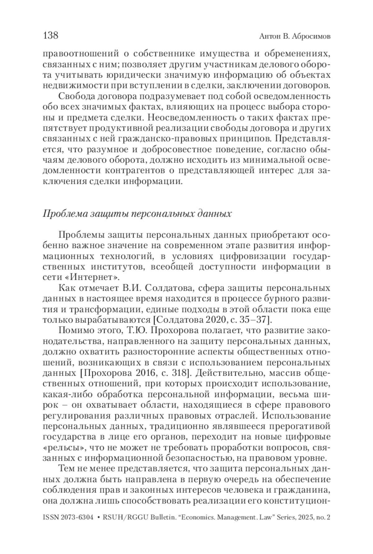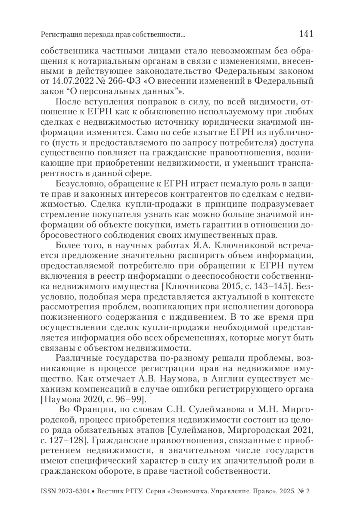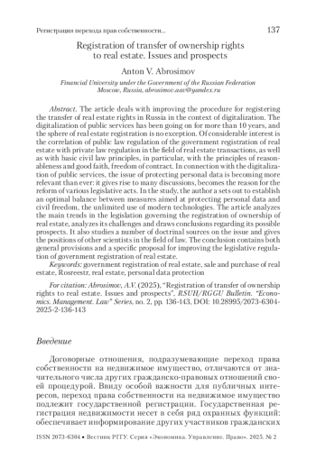 АБРОСИМОВ А. В. РЕГИСТРАЦИЯ ПЕРЕХОДА ПРАВ СОБСТВЕННОСТИ НА НЕДВИЖИМОЕ ИМУЩЕСТВО: ПРОБЛЕМЫ И ПЕРСПЕКТИВЫ // ВЕСТНИК РГГУ. СЕРИЯ: ЭКОНОМИКА. УПРАВЛЕНИЕ. ПРАВО. 2025. № 2