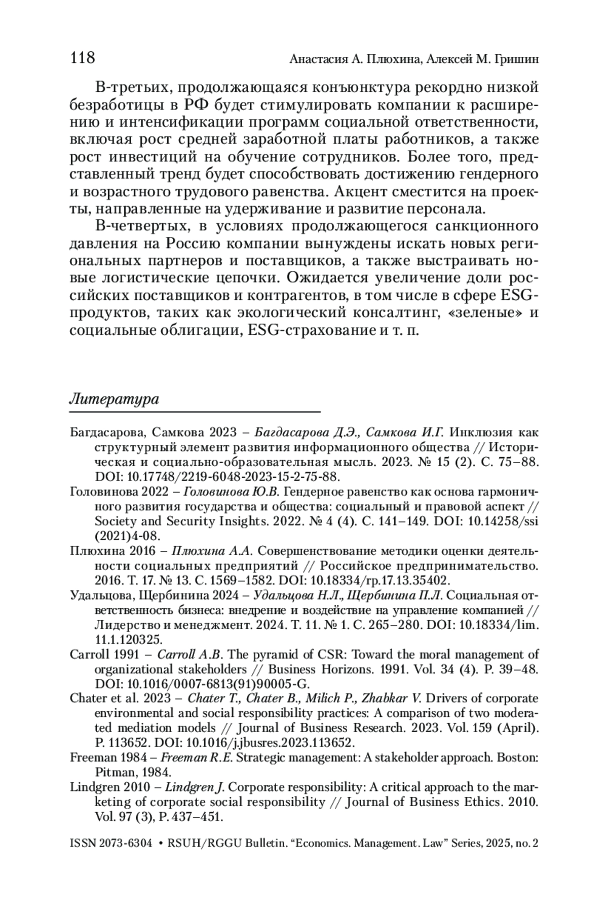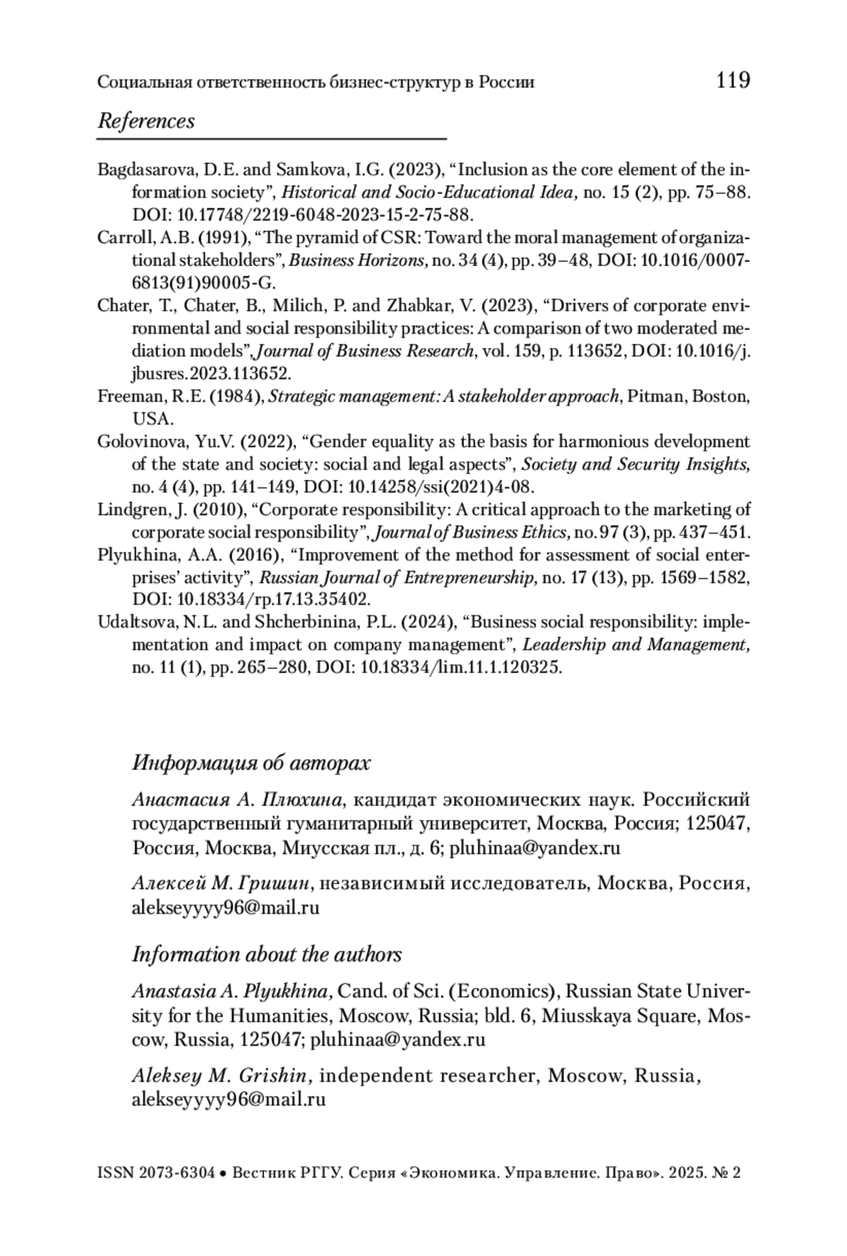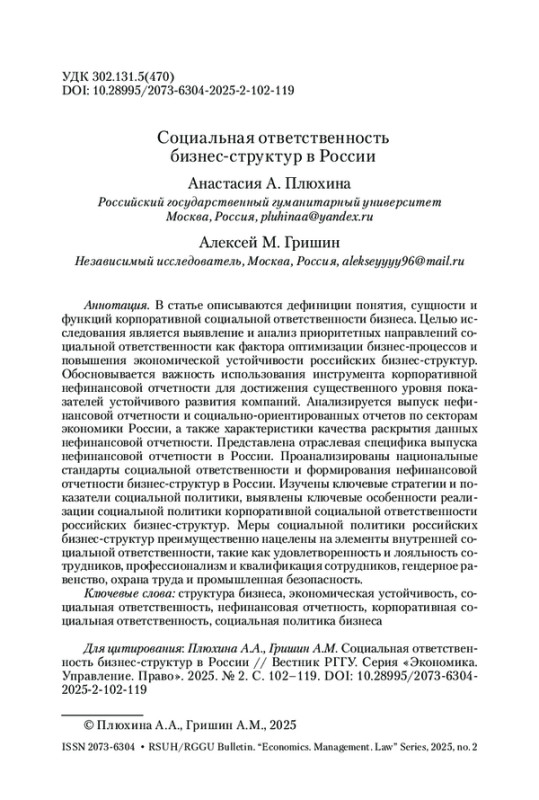 ПЛЮХИНА А. А., ГРИШИН А. М. СОЦИАЛЬНАЯ ОТВЕТСТВЕННОСТЬ БИЗНЕС-СТРУКТУР В РОССИИ // ВЕСТНИК РГГУ. СЕРИЯ: ЭКОНОМИКА. УПРАВЛЕНИЕ. ПРАВО. 2025. № 2