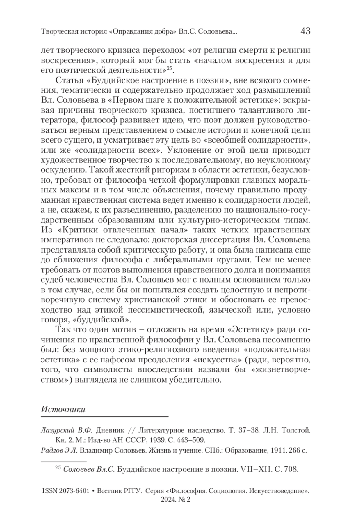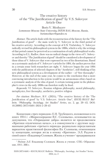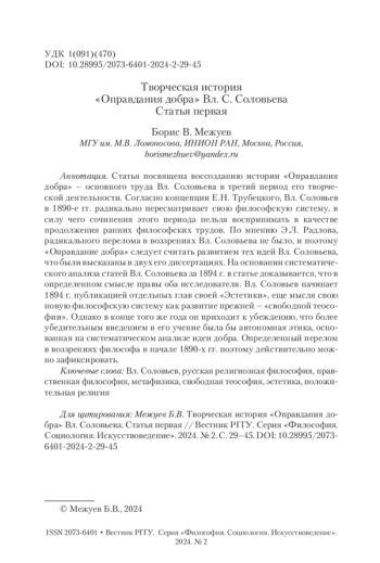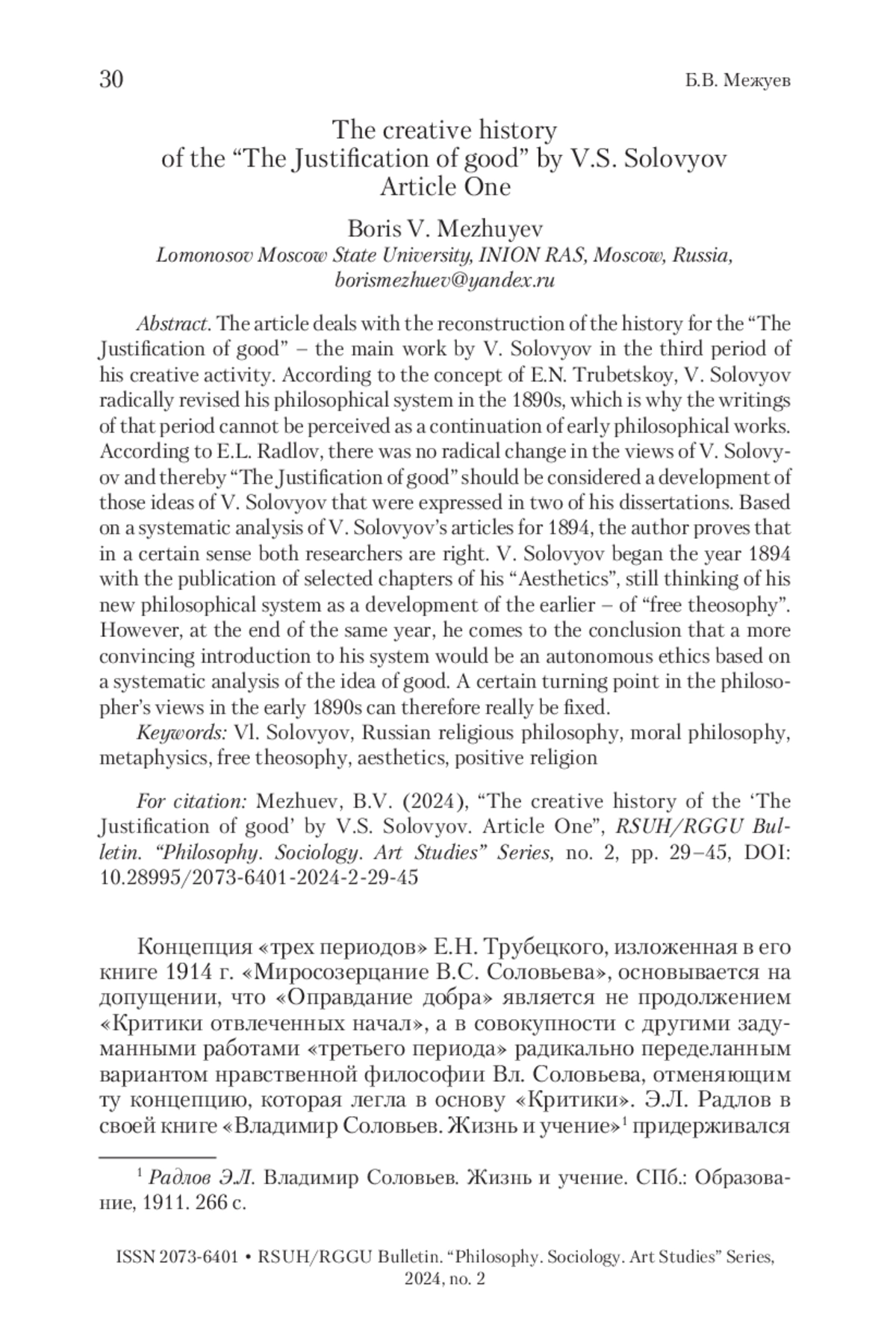 Статья посвящена воссозданию истории «Оправдания добра» – основного труда Вл. Соловьева в третий период его творческой деятельности. Согласно концепции Е. Н. Трубецкого, Вл. Соловьев в 1890-е гг. радикально пересматривает свою философскую систему, в силу чего сочинения этого периода нельзя воспринимать в качестве продолжения ранних философских трудов. По мнению Э. Л. Радлова, радикального перелома в воззрениях Вл. Соловьева не было, и поэтому «Оправдание добра» следует считать развитием тех идей Вл. Соловьева, что были высказаны в двух его диссертациях. На основании систематического анализа статей Вл. Соловьева за 1894 г. в статье доказывается, что в определенном смысле правы оба исследователя. Вл. Соловьев начинает 1894 г. публикацией отдельных глав своей «Эстетики», еще мысля свою новую философскую систему как развитие прежней – «свободной теософии». Однако в конце того же года он приходит к убеждению, что более убедительным введением в его учение была бы автономная этика, основанная на систематическом анализе идеи добра. Определенный перелом в воззрениях философа в начале 1890-х гг. поэтому действительно можно зафиксировать.
