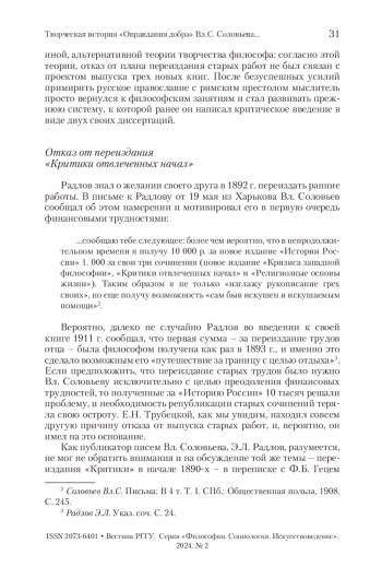 Итак, вопреки уверениям Э. Л. Радлова, Вл. Соловьев, создавая труд по нравственной философии, должен был пересмотреть свой взгляд на этику как на отчужденное от цельного знания направление духовного познания человека, требующее (с целью восполнения данной односторонности) обязательного соотнесения с эстетическими и теоретическими аспектами «свободной теософии».