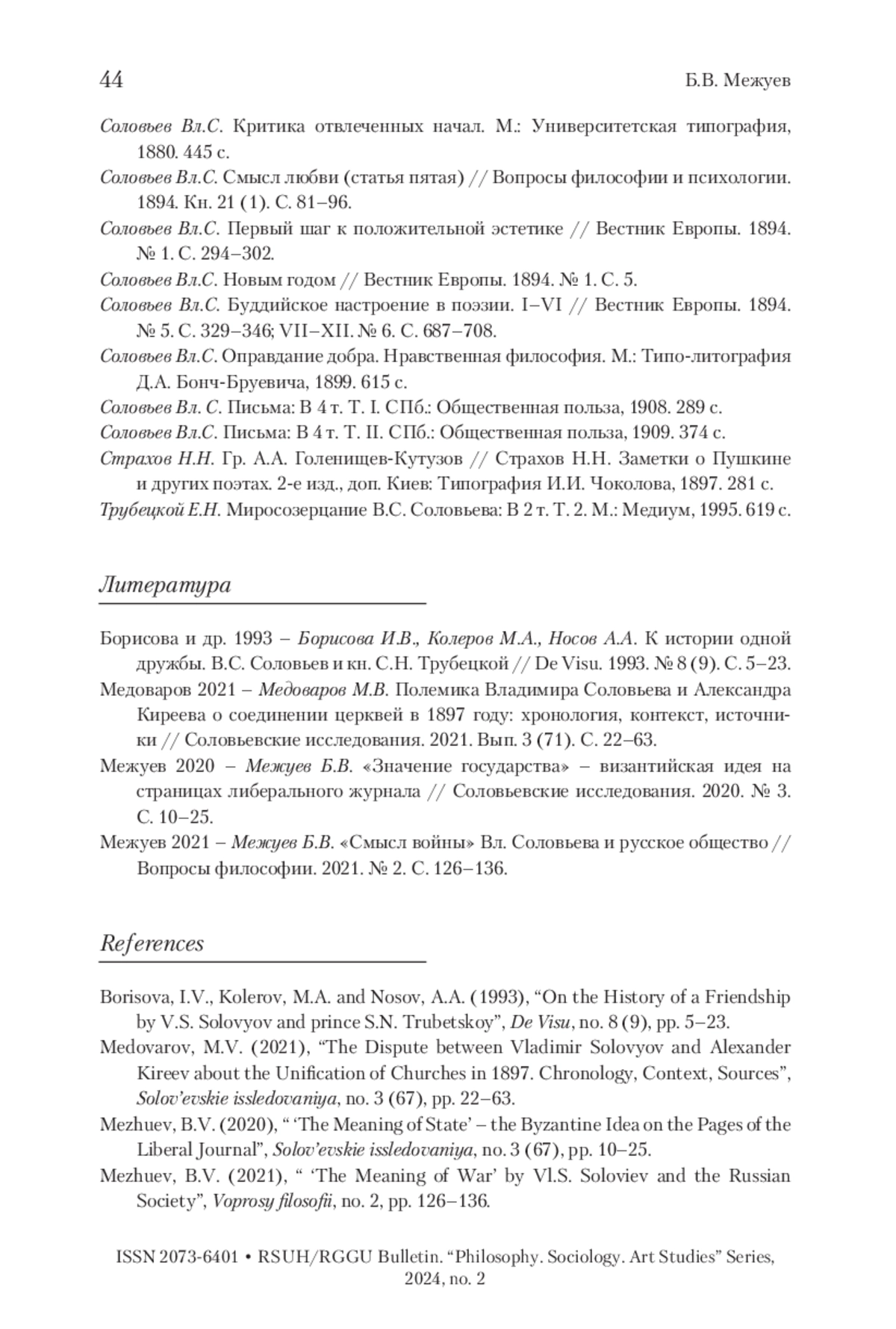 1. Борисова и др. 1993 - Борисова И.В., Колеров М.А., Носов А.А. К истории одной дружбы. В.С. Соловьев и кн. С.Н. Трубецкой // De Visu. 1993. № 8 (9). С. 5-23.
