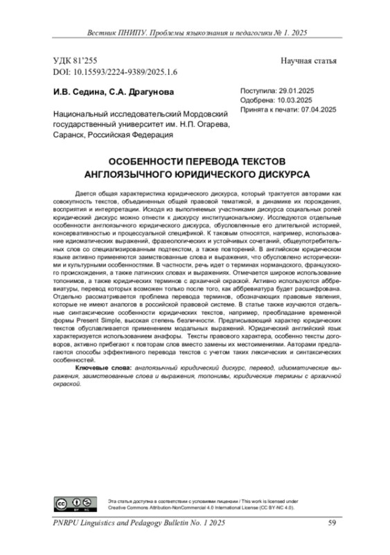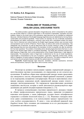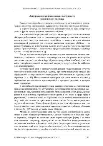 Дается общая характеристика юридического дискурса, который трактуется авторами как совокупность текстов, объединенных общей правовой тематикой, в динамике их порождения, восприятия и интерпретации. Исходя из выполняемых участниками дискурса социальных ролей юридический дискурс можно отнести к дискурсу институциональному. Исследуются отдельные особенности англоязычного юридического дискурса, обусловленные его длительной историей, консервативностью и процессуальной спецификой. К таковым относятся, например, использование идиоматических выражений, фразеологических и устойчивых сочетаний, общеупотребительных слов со специализированным подтекстом, а также повторений. В английском юридическом языке активно применяются заимствованные слова и выражения, что обусловлено историческими и культурными особенностями. В частности, речь идет о терминах нормандского, французского происхождения, а также латинских словах и выражениях. Отмечается широкое использование топонимов, а также юридических терминов с архаичной окраской. Активно используются аббревиатуры, перевод которых возможен только после того, как аббревиатура будет расшифрована. Отдельно рассматривается проблема перевода терминов, обозначающих правовые явления, которые не имеют аналогов в российской правовой системе. В статье также изучаются отдельные синтаксические особенности юридических текстов, например, преобладание временной формы Present Simple, высокая степень безличности. Предписывающий характер юридических текстов обуславливается применением модальных выражений. Юридический английский язык характеризуется использованием анафоры. Тексты правового характера, особенно тексты договоров, активно прибегают к повторам слов вместо замены их местоимениями. Авторами предлагаются способы эффективного перевода текстов с учетом таких лексических и синтаксических особенностей