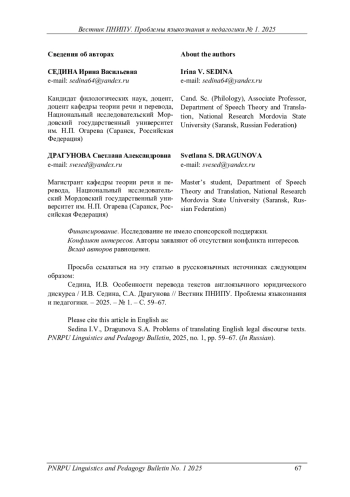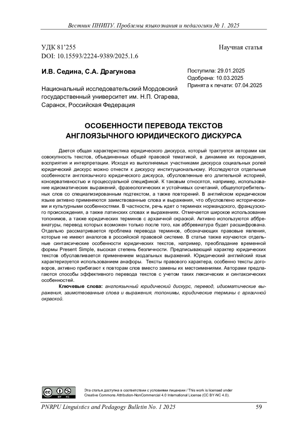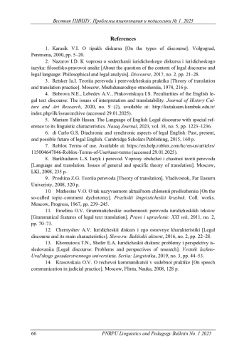 4. Bobrova, N.E. Peculiarities of the English Legal Text Discourse: The Issues of Interpretation and Translatability / N.E. Bobrova, A.V. Lebedev, I.S. Pinkovetskaya //Journal of History Culture and Art Research. 2020. Т. 9. - № 2. - С. 318. - URL: http://kutaksam.karabuk.edu.tr/index.php/ilk/issue/archive (дата обращения: 29.01.2025). EDN: JYHBZK