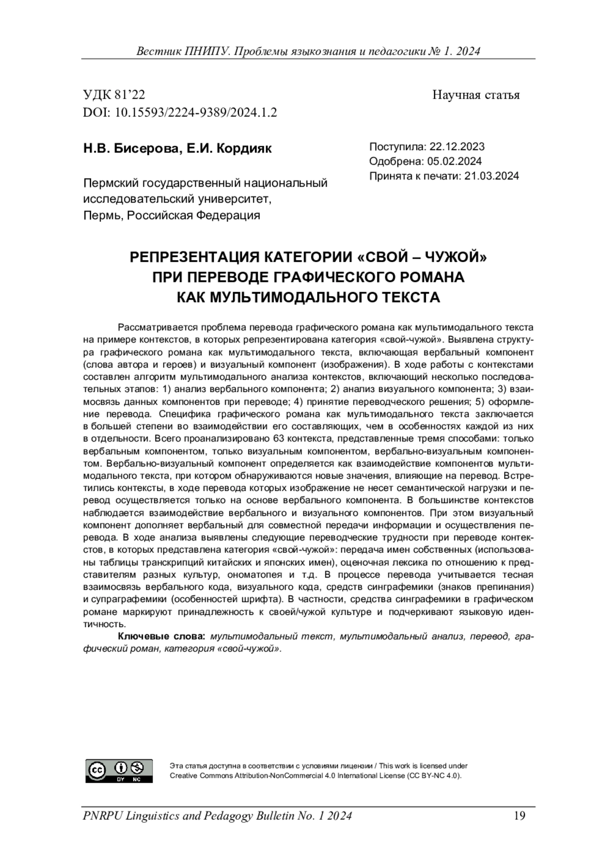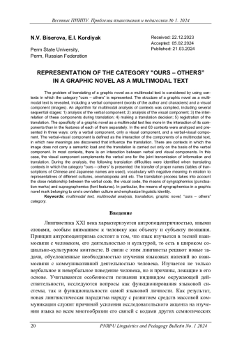 Рассматривается проблема перевода графического романа как мультимодального текста на примере контекстов, в которых репрезентирована категория «свой-чужой». Выявлена структура графического романа как мультимодального текста, включающая вербальный компонент (слова автора и героев) и визуальный компонент (изображения). В ходе работы с контекстами составлен алгоритм мультимодального анализа контекстов, включающий несколько последовательных этапов: 1) анализ вербального компонента; 2) анализ визуального компонента; 3) взаимосвязь данных компонентов при переводе; 4) принятие переводческого решения; 5) оформление перевода. Специфика графического романа как мультимодального текста заключается в большей степени во взаимодействии его составляющих, чем в особенностях каждой из них в отдельности. Всего проанализировано 63 контекста, представленные тремя способами: только вербальным компонентом, только визуальным компонентом, вербально-визуальным компонентом. Вербально-визуальный компонент определяется как взаимодействие компонентов мультимодального текста, при котором обнаруживаются новые значения, влияющие на перевод. Встретились контексты, в ходе перевода которых изображение не несет семантической нагрузки и перевод осуществляется только на основе вербального компонента. В большинстве контекстов наблюдается взаимодействие вербального и визуального компонентов. При этом визуальный компонент дополняет вербальный для совместной передачи информации и осуществления перевода. В ходе анализа выявлены следующие переводческие трудности при переводе контекстов, в которых представлена категория «свой-чужой»: передача имен собственных (использованы таблицы транскрипций китайских и японских имен), оценочная лексика по отношению к представителям разных культур, ономатопея и т. д. В процессе перевода учитывается тесная взаимосвязь вербального кода, визуального кода, средств синграфемики (знаков препинания) и супраграфемики (особенностей шрифта). В частности, средства синграфемики в графическом романе маркируют принадлежность к своей/чужой культуре и подчеркивают языковую идентичность