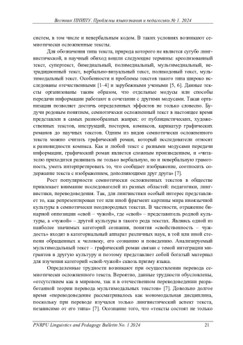7. Соловьева, Н.С. Перевод графического романа как разновидности мультимодального текста / Н.С. Соловьева, О.М. Седлярова // Гуманитарно-педагогические исследования. - 2023. - № 1. - С. 78-84. EDN: CTAXZE