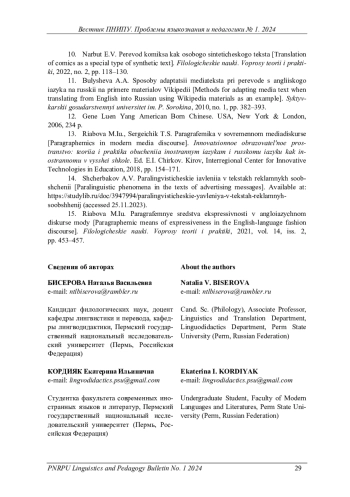 10. Нарбут, Е.В. Перевод комикса как особого синтетического текста / Е.В. Нарбут // Филологические науки. Вопросы теории и практики. - 2022. - № 2. - С. 118-130. EDN: GCQEPE