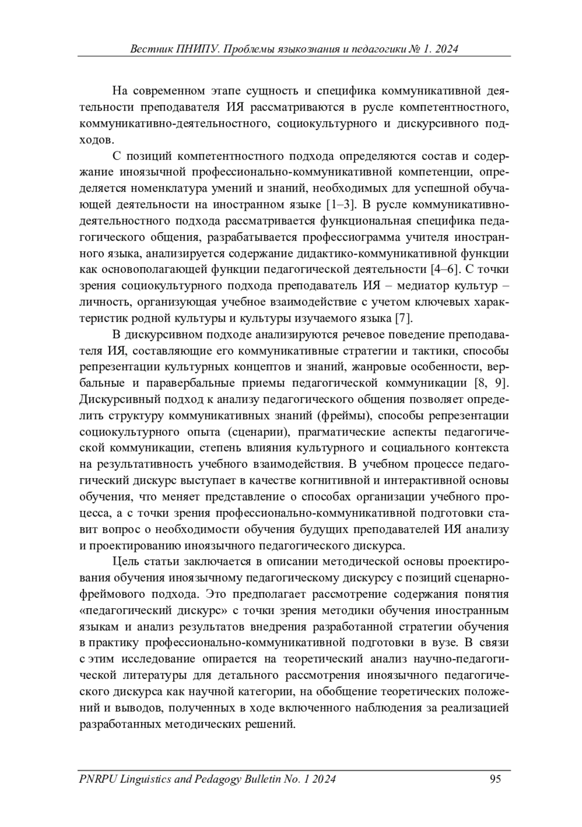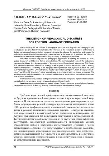 Анализируется понятие педагогического дискурса в русле современных лингвистических и педагогических научных работ, исследуется его методический потенциал. Актуальность темы обусловлена необходимостью внедрения профессионально-коммуникативного компонента в содержание практической подготовки преподавателей иностранного языка в вузе и, следовательно, разработки методической основы обучения иноязычному педагогическому дискурсу. В статье рассматриваются лингвистические, педагогические и лингводидактические подходы к определению понятия «педагогический дискурс», выявляются его ключевые характеристики. Анализируется методическая основа проектирования обучения иноязычному педагогическому дискурсу с позиций сценарно-фреймового подхода: обосновывается содержание обучения иноязычному педагогическому дискурсу; предлагается методическая стратегия организации учебного взаимодействия; проектируется структура учебного блока; формулируются принципы разработки учебных материалов. Апробация разработанных учебных материалов проходила в СПбПУ при участии студентов магистратуры, обучающихся по направлениям подготовки 44.04.01 «Педагогическое образование» и 45.04.02 «Лингвистика» со специализацией в методике обучения иностранным языкам. Полученные результаты позволяют оценить результативность предлагаемых методических решений и обобщить накопленный практический опыт. Представленные в статье теоретические и практические обобщения могут быть востребованными в организации профессионально-коммуникативной подготовки будущих преподавателей иностранного языка в вузе