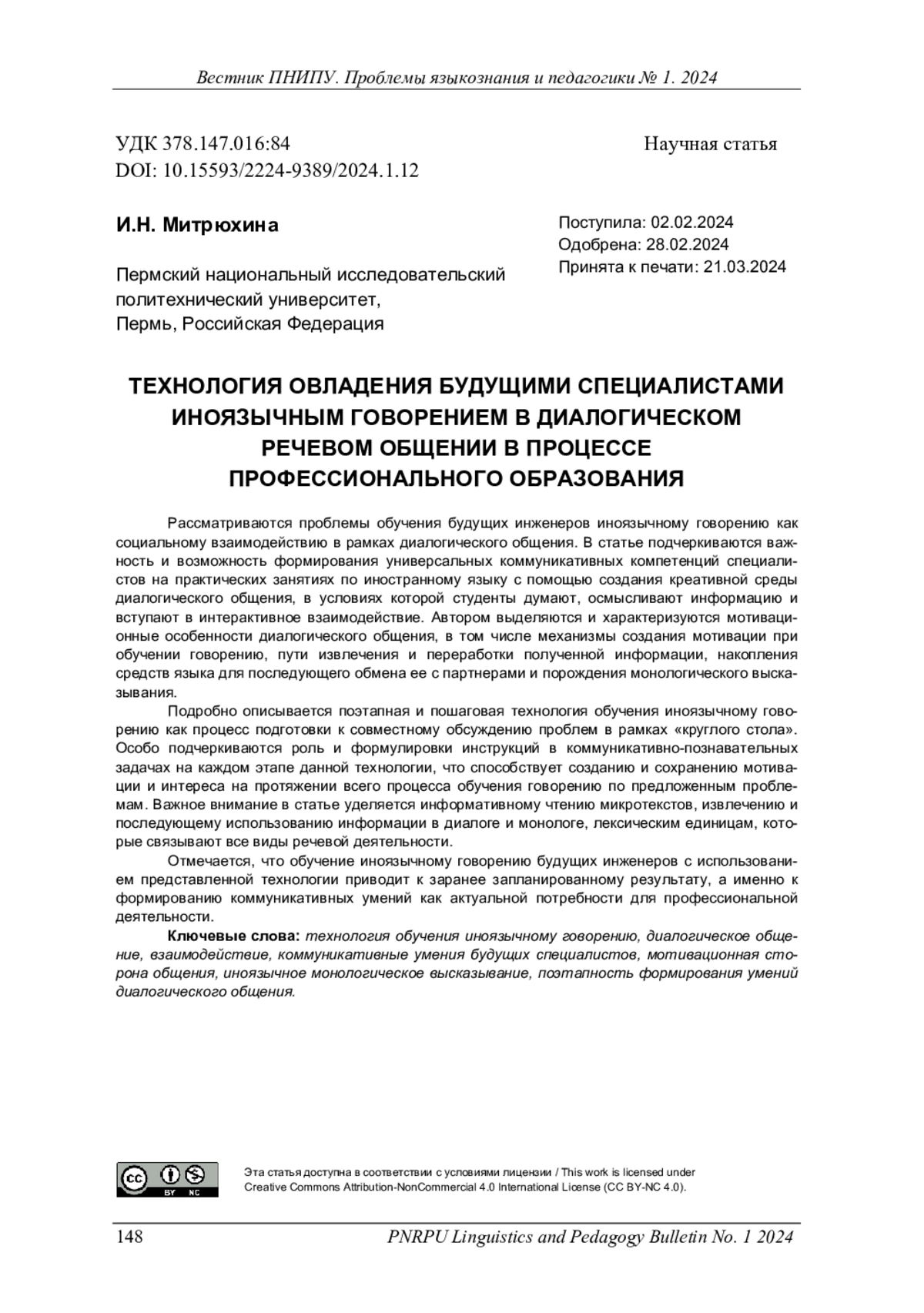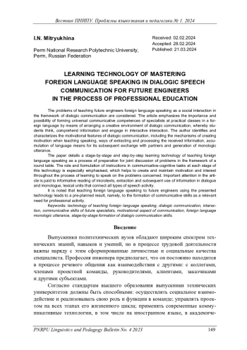 Рассматриваются проблемы обучения будущих инженеров иноязычному говорению как социальному взаимодействию в рамках диалогического общения. В статье подчеркиваются важность и возможность формирования универсальных коммуникативных компетенций специалистов на практических занятиях по иностранному языку с помощью создания креативной среды диалогического общения, в условиях которой студенты думают, осмысливают информацию и вступают в интерактивное взаимодействие. Автором выделяются и характеризуются мотивационные особенности диалогического общения, в том числе механизмы создания мотивации при обучении говорению, пути извлечения и переработки полученной информации, накопления средств языка для последующего обмена ее с партнерами и порождения монологического высказывания. Подробно описывается поэтапная и пошаговая технология обучения иноязычному говорению как процесс подготовки к совместному обсуждению проблем в рамках «круглого стола». Особо подчеркиваются роль и формулировки инструкций в коммуникативно-познавательных задачах на каждом этапе данной технологии, что способствует созданию и сохранению мотивации и интереса на протяжении всего процесса обучения говорению по предложенным проблемам. Важное внимание в статье уделяется информативному чтению микротекстов, извлечению и последующему использованию информации в диалоге и монологе, лексическим единицам, которые связывают все виды речевой деятельности. Отмечается, что обучение иноязычному говорению будущих инженеров с использованием представленной технологии приводит к заранее запланированному результату, а именно к формированию коммуникативных умений как актуальной потребности для профессиональной деятельности