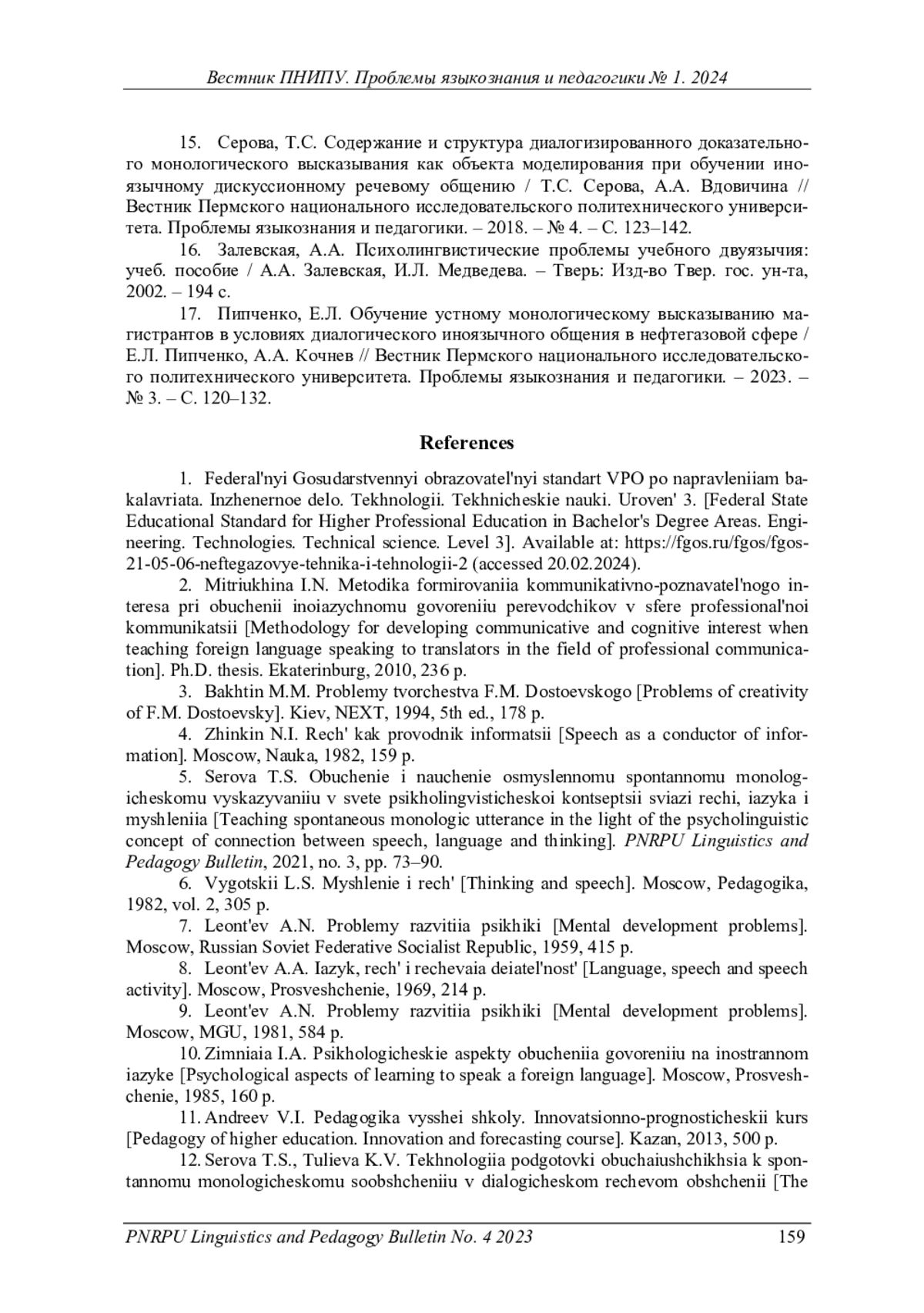 13. Бердникова, А.А. Формирование речевых умений спонтанного доказательного монологического высказывания в иноязычном речевом общении / А.А. Бердникова, Т.С. Серова // Вестник Пермского национального исследовательского политехнического университета. Проблемы языкознания и педагогики. - 2023. - № 4. - С. 58-76. EDN: AGVLLO