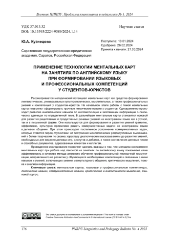 Рассматривается методический потенциал ментальных карт как средства формирования лингвистических, универсальных культурологических, мыслительных, а также профессиональных умений и компетенций у студентов-юристов. На начальном этапе работы с темой ментальные карты позволяют сформировать прочные лексические навыки у студентов. Одновременно происходит развитие аналитических навыков по систематизации и экспликации информации о лексических единицах по определенной теме. В дальнейшем ментальные карты становятся основой для развития рецептивных и продуктивных речевых умений на иностранном языке как в устной, так и в письменной форме. Они используются для формирования и развития умений грамотно, эффективно, культурно приемлемо решать коммуникативные задачи на иностранном языке в деловом общении. При этом происходит постепенное усложнение коммуникативных задач, которые ставятся перед студентами: от построения монологических репродуктивных высказываний к более творческим по своему характеру диалогическим высказываниям до развития умений, необходимых для ведения деловых игр, диспутов и дебатов, а также составления деловых писем и служебных документов, адресованных клиентам и коллегам. Проведенное исследование позволяет сделать выводы о том, что методика составления ментальных карт при работе над лексикой на занятиях по английскому языку показывает свою эффективность в качестве метода активного обучения профессиональной иноязычной коммуникации, направленного на развитие у обучающихся необходимых компетенций и связанных с ними навыков и умений, включающих умения межкультурного общения, критического мышления, поиска и анализа информации.
