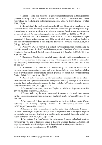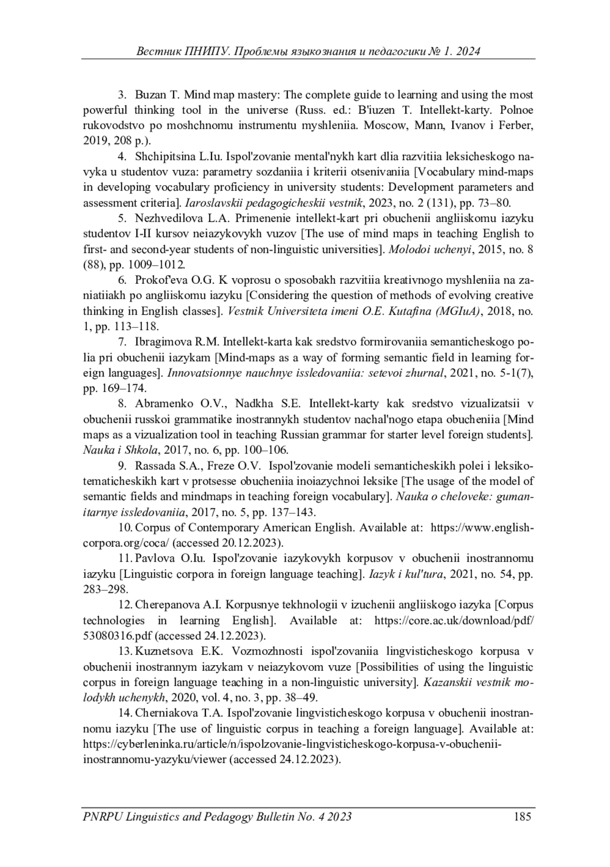4. Щипицина, Л.Ю. Использование ментальных карт для развития лексического навыка у студентов вуза: параметры создания и критерии оценивания / Л.Ю. Щипицина // Ярослав. пед. вестник. - 2023. - № 2 (131). - С. 73-80. EDN: MKOYDO