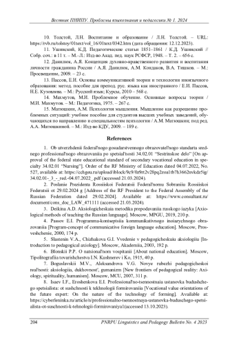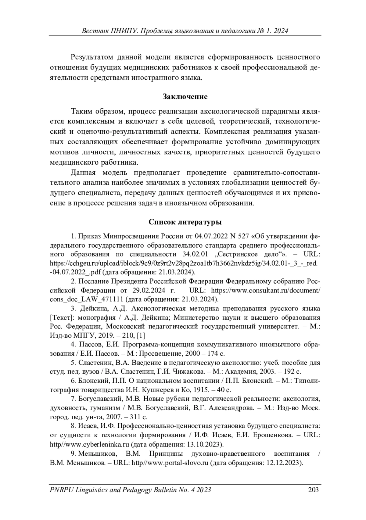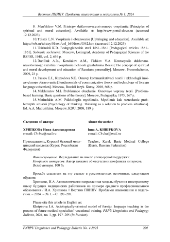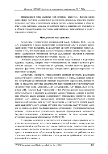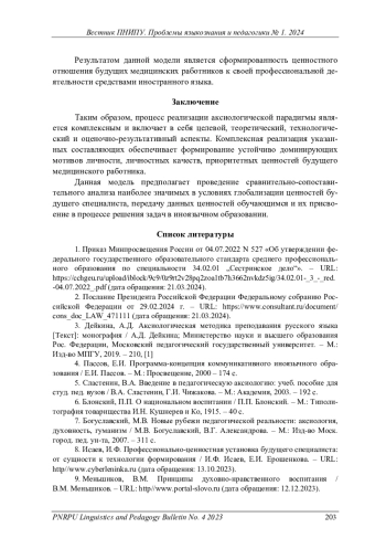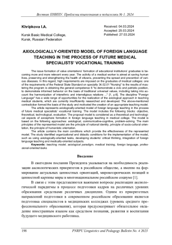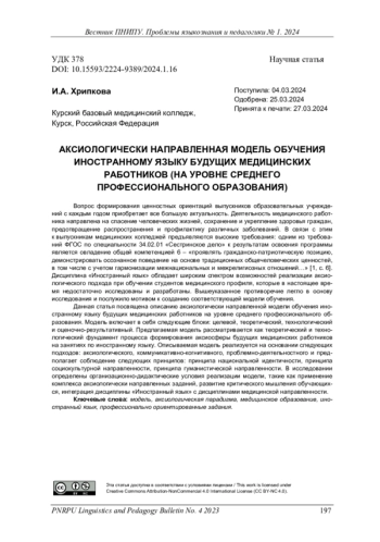 ХРИПКОВА И. А. АКСИОЛОГИЧЕСКИ НАПРАВЛЕННАЯ МОДЕЛЬ ОБУЧЕНИЯ ИНОСТРАННОМУ ЯЗЫКУ БУДУЩИХ МЕДИЦИНСКИХ РАБОТНИКОВ (НА УРОВНЕ СРЕДНЕГО ПРОФЕССИОНАЛЬНОГО ОБРАЗОВАНИЯ) // ВЕСТНИК ПЕРМСКОГО НАЦИОНАЛЬНОГО ИССЛЕДОВАТЕЛЬСКОГО ПОЛИТЕХНИЧЕСКОГО УНИВЕРСИТЕТА. ПРОБЛЕМЫ ЯЗЫКОЗНАНИЯ И ПЕДАГОГИКИ. 2024. № 1